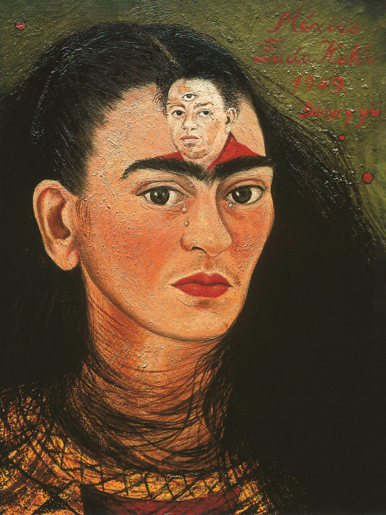 Was sich alles an Frida Kahlos Selbstporträt von 1949 ablesen lässt: Die Künstlerin ist voller Schmerzen und Trauer, Tränen rollen über ihre Haut, und auf ihrer Stirn prangt wie das spirituelle dritte Auge der Erleuchtung das Gesicht von Diego Rivera, der großen Liebe ihres Lebens. „Ich hatte zwei schwere Unfälle in meinem Leben“, hat sie einmal gesagt. „Der erste war, als mich eine Straßenbahn überfahren hat, der andere war Diego.“ Ihr offenes Haupthaar verbindet sich auf dem Bild mit dessen Lockenschopf und schlingt sich wie eine Umarmung – oder wie ein Würgegriff? – um ihren Hals.