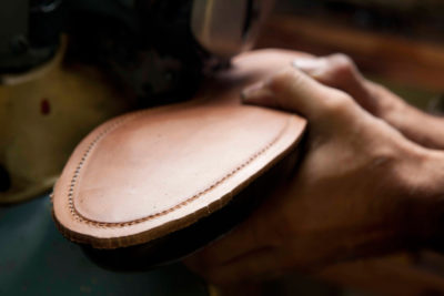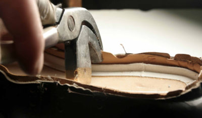 Hernach folgt das „Oberteilsteppen“: Die Teile werden zusammengefügt und mit dem Futter vernäht. Beim “Zwicken“ wird dann das Oberteil über den Leisten gespannt, eine dem Fuß nachgebildete Form aus Holz oder Kunststoff. Anschließend werden Laufsohle und Oberteil verbunden. Die ledernen Laufsohlen werden direkt auf den Rahmen, einen etwas drei Zentimeter breiten Lederstreifen, genäht. Dieser wird wiederum mit dem Oberteil verbunden. Nach dem Fräsen der Sohlenkante wird der Lederabsatz aufgedrückt und zurechtgefräst. Eine Besonderheit bei Ludwig Reiter ist das anschließende Bimsen: Damit die Naht an der Laufsohle vor Abrieb geschützt ist, wird sie zum Teil in der Sohle eingearbeitet.