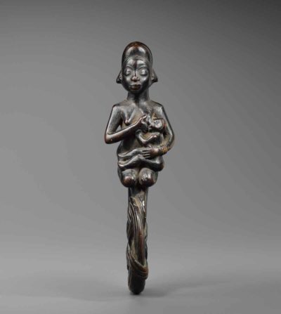 Bei Bernard Dulon besticht ein kultisches afrikanisches Objekt des 19. Jahrhunderts, das die Innigkeit zwischen Mutter und Säugling unterstreicht.
