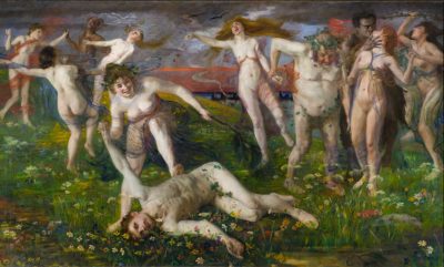 Ein tolles Fest ist das „Bacchanal“ auf dem großen, jüngst restituierten Gemälde von Lovis Corinth, der 1896 der Ausgelassenheit, dem erotischen Treiben und nackten Körper huldigt. Simon Dickinson taxiert das Werk um 750.000 Euro.