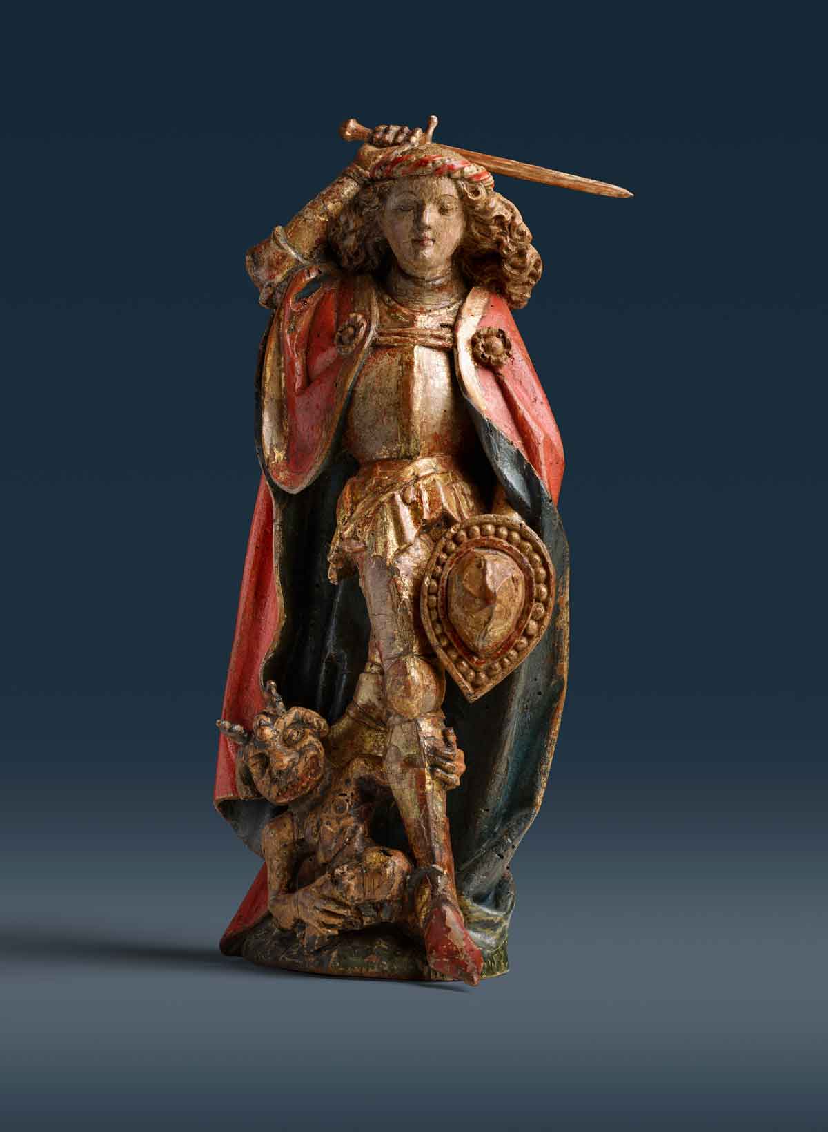 Bewegung war immer ein Thema der Kunst. Erzengel Michael, der Drachentöter, schwingt sein Schwert beim Kunsthandel Senger. Die mittelalterliche Skulptur kostet 48.000 Euro.