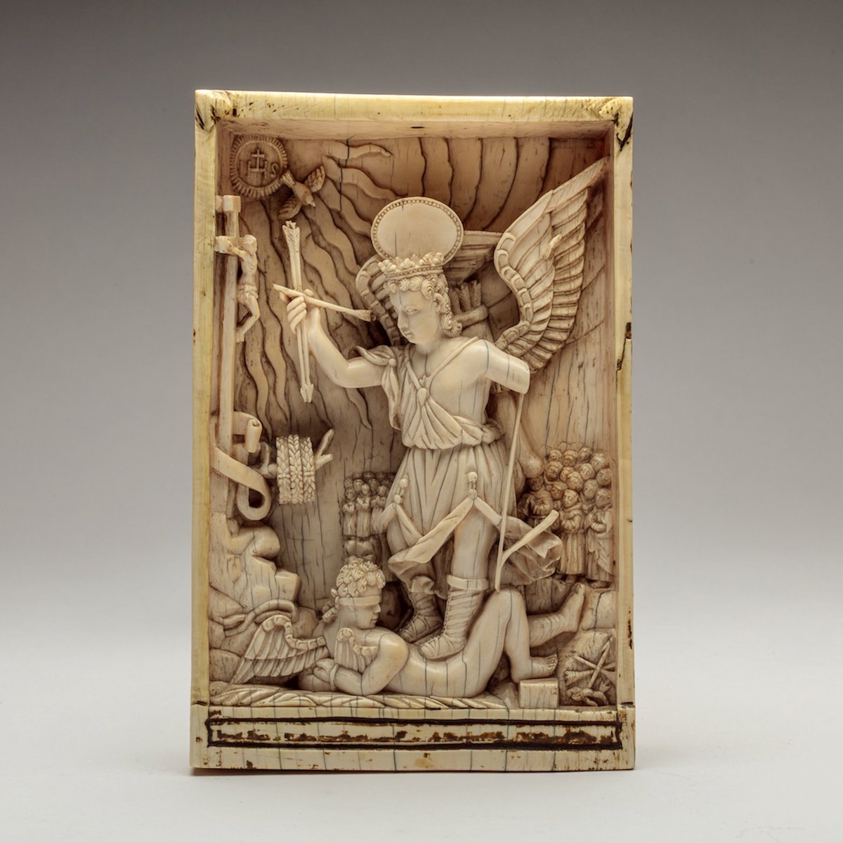 Nach der Zerstörung von Kotte im Süd-westen des heutigen Sri Lankas entwickelte sich Colombo zum Zufluchtsort für Künstler: Im frühen 17. Jahrhundert entstand dort vermutlich die knapp 20 Zentimeter große Elfenbein-Plakette, die Amir Mohtashemi an seinem Stand präsentiert. In Auftrag gegeben wurde die Schnitzarbeit von Jesuiten, als Vorlage diente aller Wahrscheinlichkeit nach ein Kupferstich von Hieronymus Wierix, der den Sieg der himmlischen über die irdische Liebe darstellt. Foto: Amir Mohtashemi