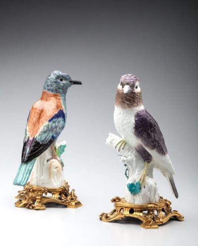 Friedrich Elias Meyer, ab 1748 in Meißen tätig, schuf seine Porzellantiere am liebsten nach lebenden Modellen: So wirkt auch die Blauracke aus dem Hause KPM, die Michele Beiny für 75 000 Dollar im Paar anbietet, so naturgetreu, als würde sie sich gleich von ihrem Ast erheben. Während die Ausformung aus der zweiten Hälfte der 1760er-Jahre stammen dürfte, geht der Goldbronze-Sockel auf den Pariser Ebenisten Henry Dasson (1825–1896) zurück. Foto: Michele Beiny