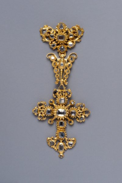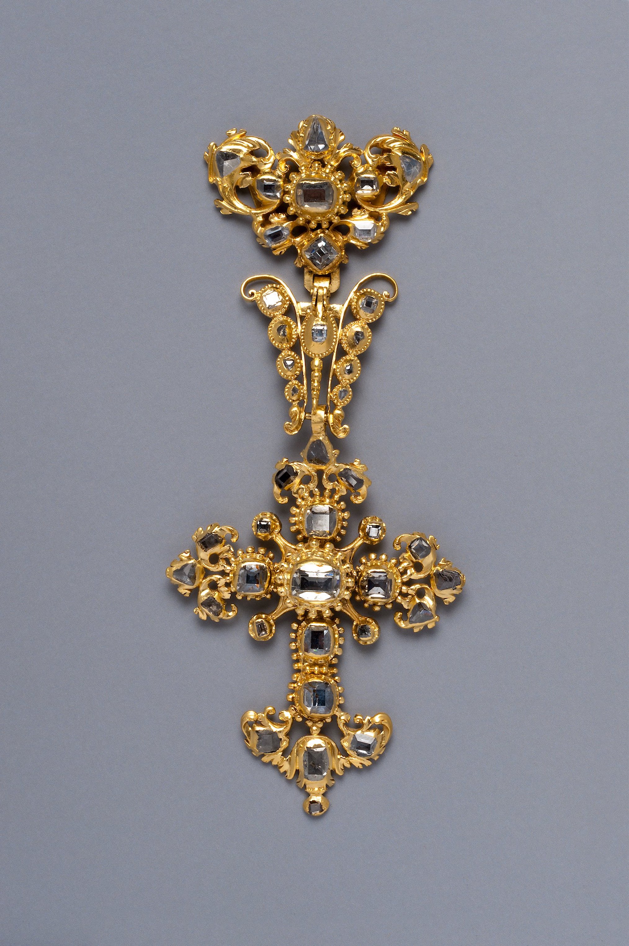 Adelige Damen, die im Spanien des 17. Jahrhunderts viel auf sich hielten, trugen ihren katholischen Glauben stolz auf der Brust: In Provinzen wie Salamanca bestimmten aufwendige, mit Diamanten besetzte Goldkreuze, die an einer Schleife um den Hals gebunden wurden, die Mode. Wer den Glamour des ausgehenden Siglo de Oro ins eigene Schmuckkästchen importieren will, sollte für das 9 mal 4 Zentimeter große Exemplar von 1700 um die 40 000 Euro einplanen. Angeboten wird es von der spanischen Händlerin Deborah Elvira Young, die sich auf historischen Schmuck ihrer Heimat spezialisiert hat. Foto: Deborah Elvira