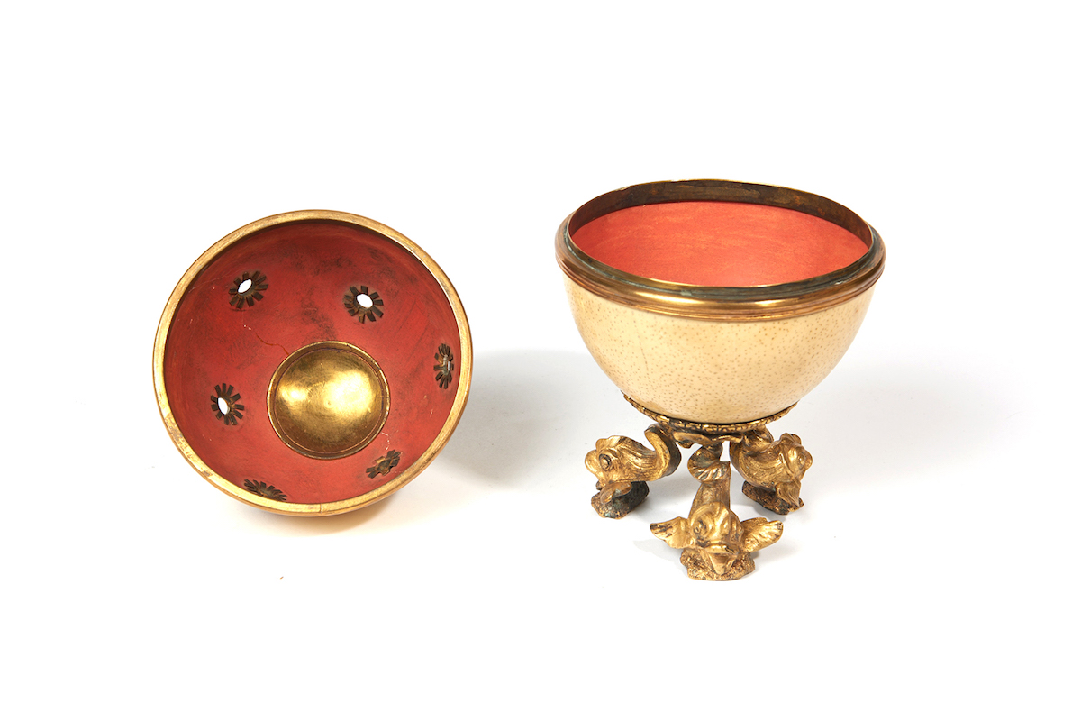 Straußeneier wurden im 18. Jahrhundert als kostbare Exotica gehandelt und verarbeitet – wie hier mit vergoldeter und ziselierter Bronze zum Potpourri für duftende Kräuter und Essenzen. Die Düsseldorfer Galerie Gierhards bietet an ihrem Stand ein seltenes Paar mit jeweils drei vergoldeten Delfinfüßen für 65 000 Euro an. Es wurde zwischen 1720 und 1730 in Paris geschaffen: Wahrscheinlich erfrischte es die Luft für Mitglieder der französischen Königsfamilie. Foto: Ralph Gierhards Antiques/Fine Art