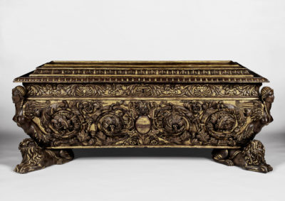 Giovanni Strozzi und Maria Carnesecchi heirateten in der ersten Hälfte des 16. Jahrhunderts. Die Ehe hielt nicht ewig – im Gegensatz zu jenen zwei florentinischen Hochzeits-Cassoni, die sich unter den Hochzeitsgaben befanden. Diese Herkunft legt das Wappen im Zentrum der reich verzierten Fronten aus teils vergoldetem Nussbaum nahe. Die Galerie Neuse bietet beide Truhen an, die in bedeutenden Sammlungen wie der des Bankiers Guy de Rothschild waren. Foto: Galerie Neuse