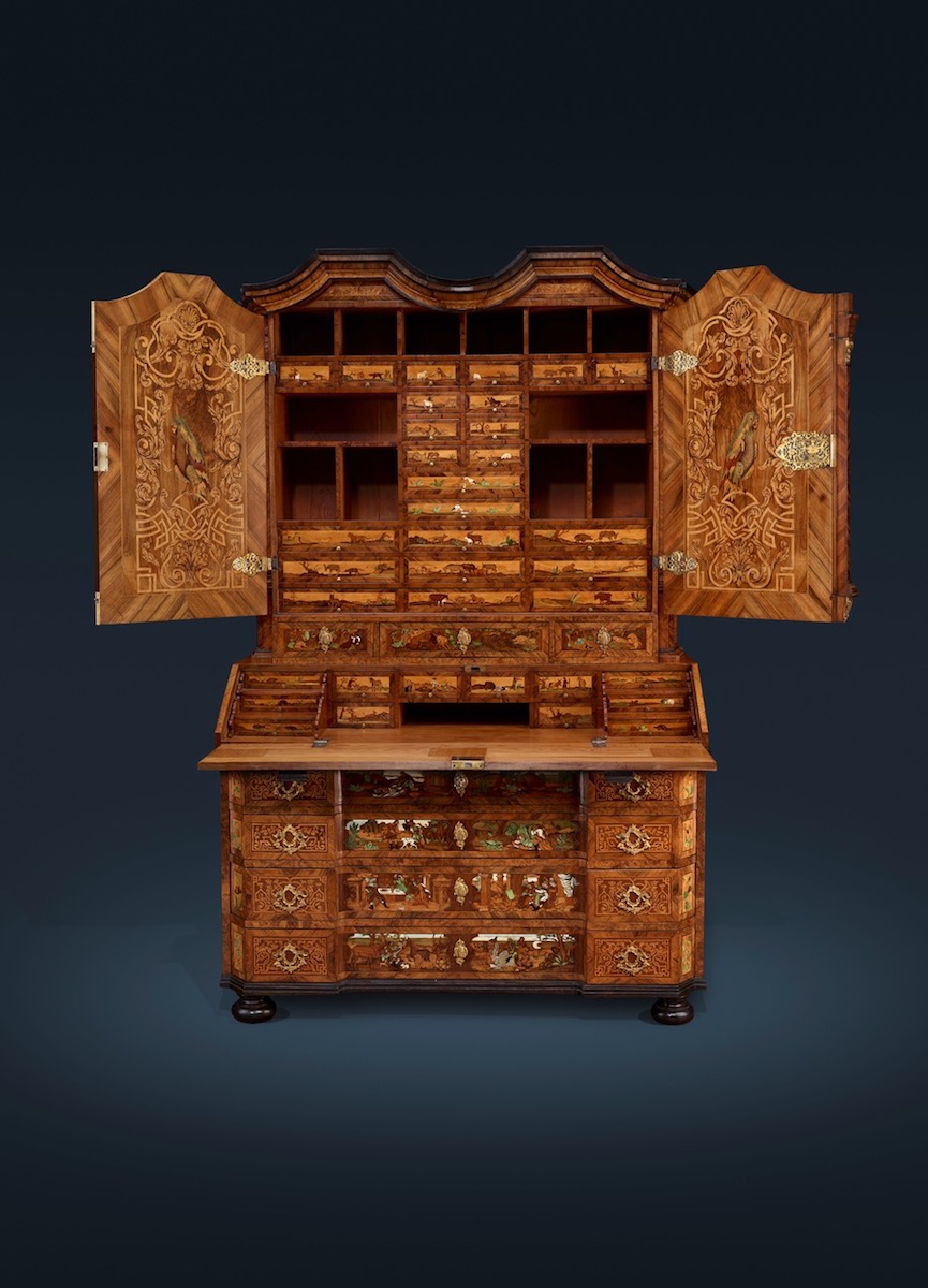 Senger (Bamberg), ein wahres Wunderwerk der Intarsienkunst, ist wohl in Prag um 1725/1730 entstanden. Mythologische Szenen in grandiosen Trompe-l’oeil-Architekturen beeindrucken außen auf den Flügeltüren, während die vielen Schubladen im Inneren mit Tierwesen aus Aesops Fabeln illustriert sind. Neben verschiedensten Hölzern von Buchsbaum über Oliven- bis zu Amaranthholz kommen auch Zinn, Messing, durchgefärbtes Elfenbein und Perlmutt zum Einsatz. Der Preis für das einzigartige Möbel liegt im mittleren sechsstelligen Bereich. Foto: Senger Bamberg Kunsthandel