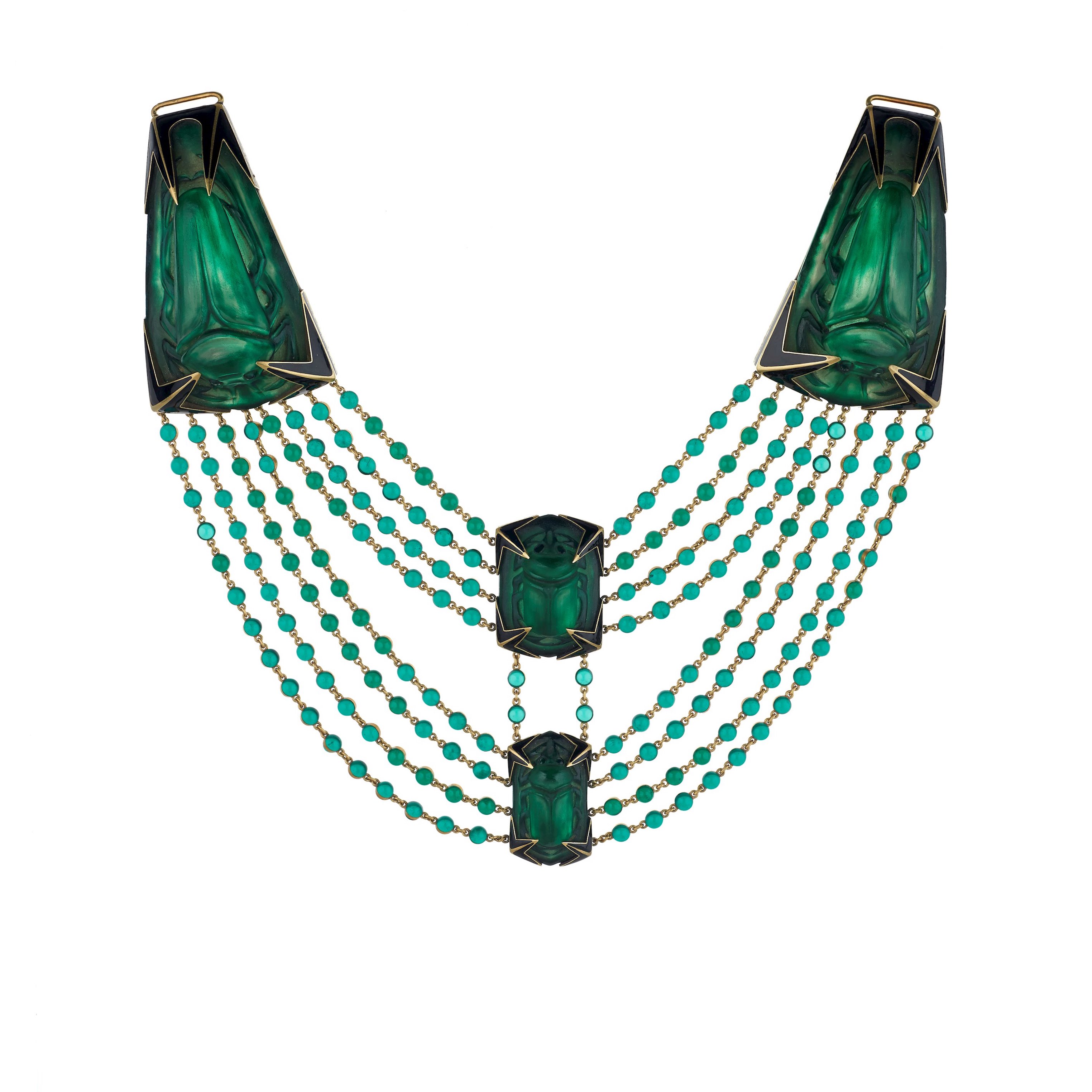 Ab 1890 experimentierte René Lalique mit Glas, um daraus Schmuck zu formen. Als knapp zehn Jahre später sein Collier im ägyptischen Stil entstand, war der legendäre Pariser Gestalter auf der Höhe seiner Kunst: Acht Reihen luzider grüner Perlen werden von vier gläsernen Elementen in Form grüner Skarabäen gehalten. Die goldene Fassung mit ihren schwarz emaillierten Dornen machen das außer-gewöhnliche Stück des Art déco komplett. Angeboten wird es vom Londoner Juwelenhändler Wartski Ltd. für einen sechsstelligen Betrag. Foto: Wartski