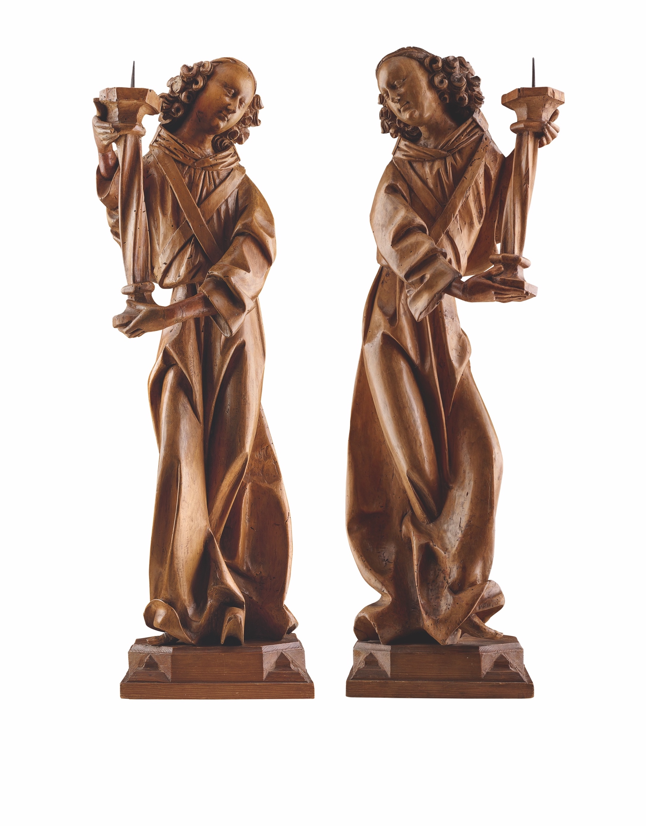 Unseren letzten Halt machen wir bei der Händlerfamilie Senger. In dem gegenüber dem Stammsitz gelegenen neuen Haus geht Thomas Herzog, Geschäftsführer und Schwiegersohn des Unternehmensgründers Walter Senger, noch einen Schritt weiter und paart gotische Skulpturen mit zeitgenössischer Kunst und Mid-Century-Design. Der Vorstellungskraft des begehrten Sammlernachwuchses möchte er damit auf die Sprünge helfen: wohnliches Setting, modernes Lebensgefühl, darin die Topstücke. Sogar eine kleine Übernachtungssuite steht für die entschlossenen wie auch zögerlichen Kunden bereit, samt schmalem Ankleidezimmer, dem ein enormer Augsburger Renaissanceschrank mit fulminanten Eisenbeschlägen unerwartet Tiefe gibt. Wer behauptet bitte, mit diesen alten Riesenschränken ließe es sich nicht mehr gut leben? Herzog kann sich diese für Bamberger Verhältnisse recht kühne Mixtur leisten, denn die alte Kunst, mit der zu neunzig Prozent der Umsatz bestritten wird, hält dem Kräftemessen mühelos stand. Das reklamieren schon die beiden Engel aus der Werkstatt des Veit Stoß, die einen coolen Schreibtisch von George Nelson flankieren. „Sehen Sie nur die Bewegung, wie die Engel in sich gewunden sind. Schlank wie Mannequins und ein Lächeln im Gesicht. So zugeneigt.“Wenn es um seine Figuren geht, spricht aus dem sonst eher zurückhaltenden Senger die Leidenschaft.