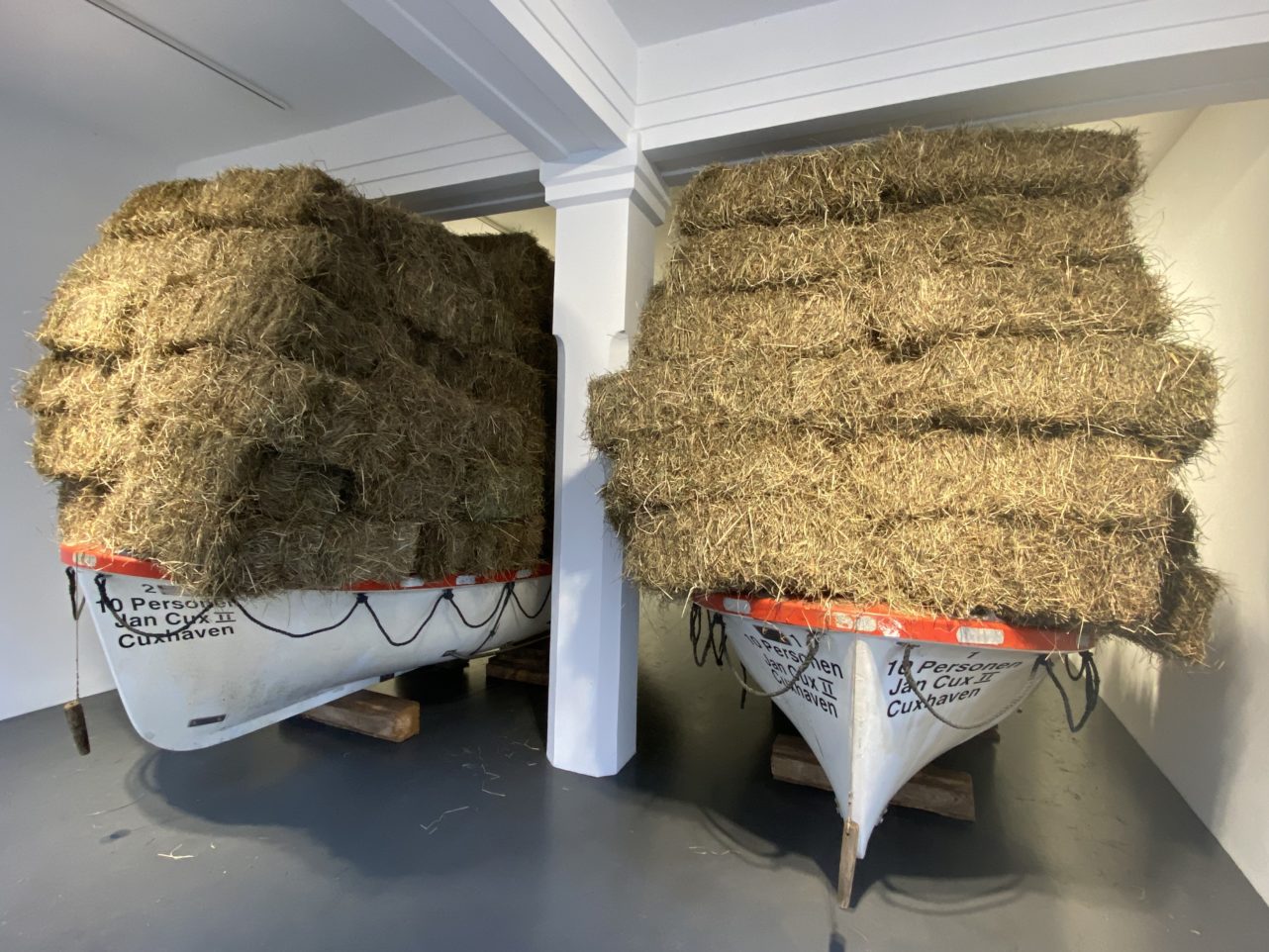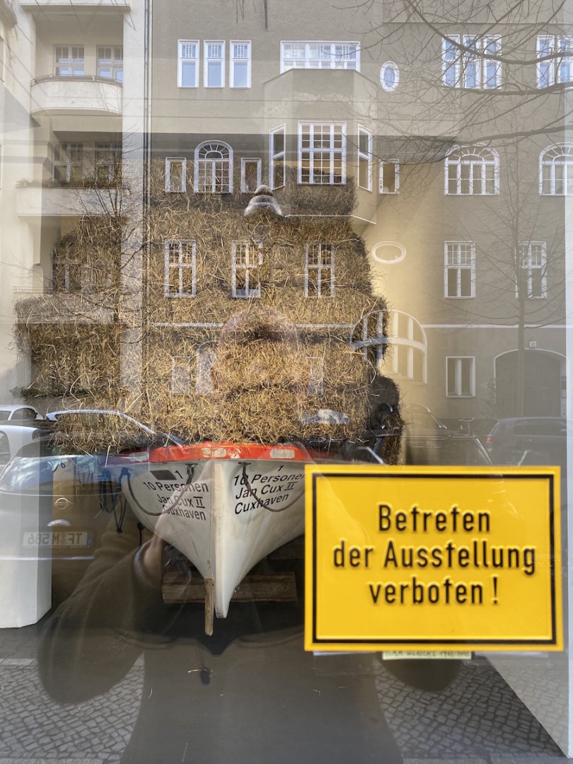 ‚Rette sich wer kann/Every man for himself‘ von Christiane Möbus, eine eindrückliche Installation aus dem Jahr 2001, ist kein politisch apodiktisches Statement, sondern eine poetische Setzung. Assoziativ nach allen Seiten offen. Weder moralisch noch tagespolitisch noch apokalyptisch will sie sein. Aber mit leichter Ironie trifft sie den Nerv des Betrachters. Eher ein Symbol für unseren seelischen Zustand Grenzen und Einschränkungen zu überwinden. Vielleicht aber auch eine Provokation unsere eigene Haltung und Empathiefähigkeit in so schwierigen Zeiten kritisch zu hinterfragen. Wie sehr sich diese Arbeit nun im Zeitgeist gerade wiederfinden würde, haben wir uns vor der Eröffnung im Traum nicht vorstellen können. Umso schöner zu sehn, dass diese 20 Jahre alte Installation nichts an Brisanz und Spannung und Aktualität verloren hat.«