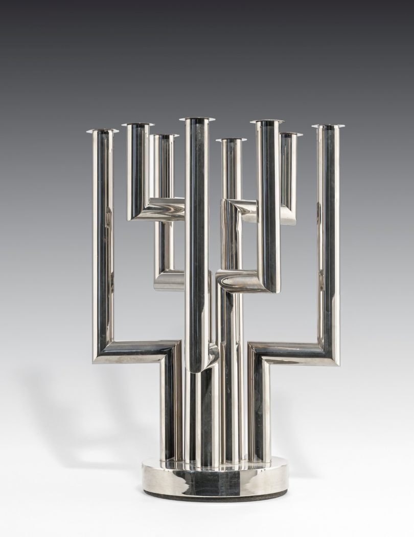 Auf glamouröse Weise schnörkellos war die Moderne der Zwanzigerjahre – so wie eben dieser achtarmige Kerzenleuchter aus der Werkstätte Hagenauer in Wien. Den nach Franz Hagenauers Entwurf von 1929 gefertigten Messingleuchter bietet die Wiener Galerie Bel Etage als Zwillingspaar für 48 000 Euro an.