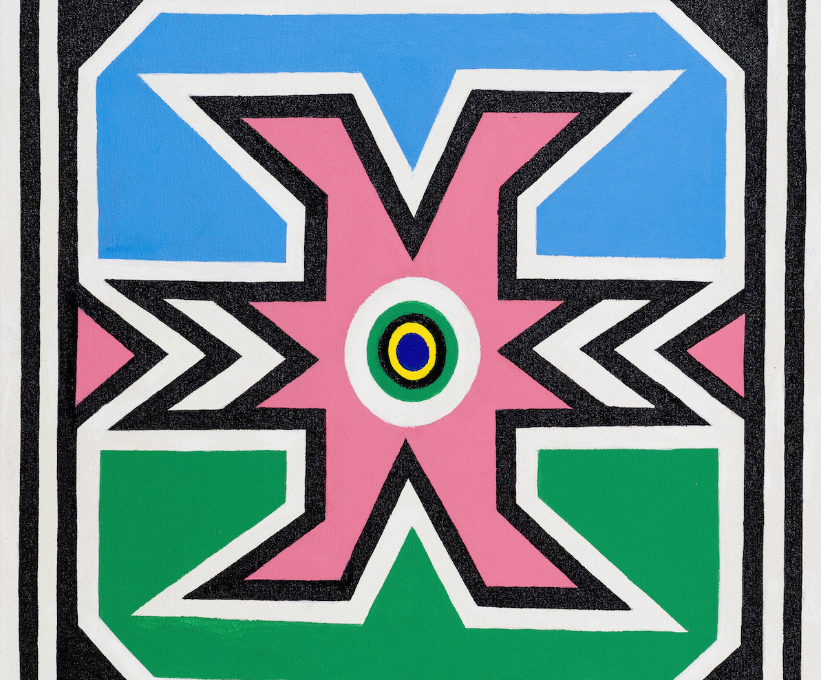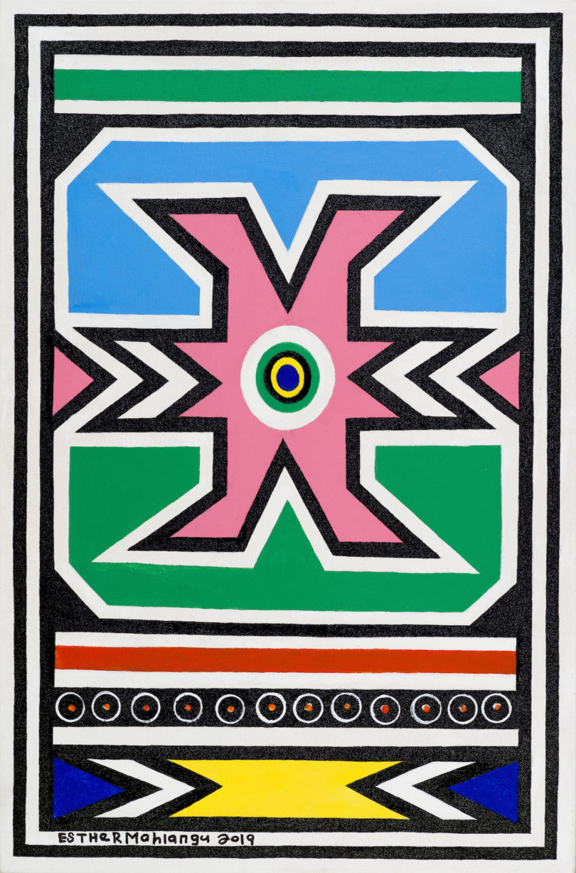 Esther Mahlangu hat die Wandmalereien der Ndebele auf die Leinwand und den internationalen Kunstmarkt gebracht. Die Melrose Gallery vertritt die 85-Jährige und bietet „Ndebele Abstract“ (2019) für 5462 Dollar an.