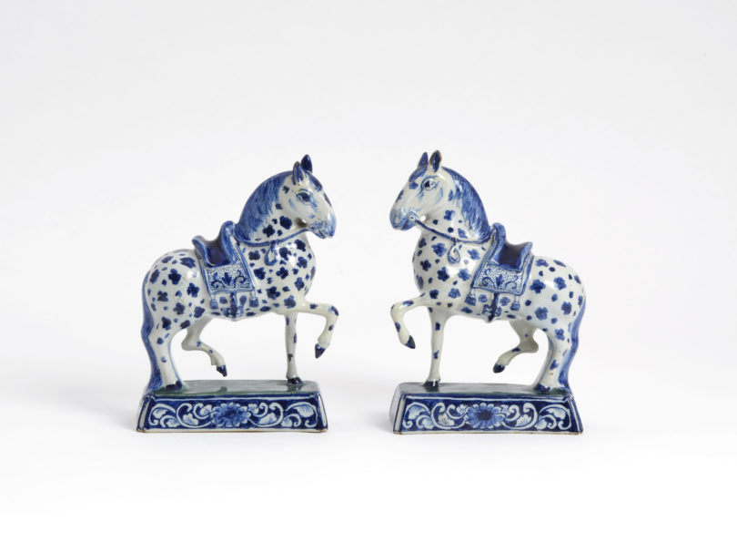 Auf die Frage nach unserer Lieblingsfarbe lautet die statistisch häufigste Antwort „Blau“. Dieses Phänomen mag ein Grund sein, weshalb Keramik aus Delft auch heute noch den Zeitgeschmack trifft. Für 13 500 Euro bietet der Amsterdamer Antiquitätenhändler Aronson zwei um 1770 geschaffene Pferdefiguren aus Delfter Blau an, die sich direkt in unser Herz getänzelt haben.
