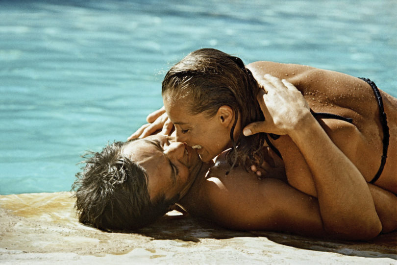 Ihr Welterfolg in der Rolle der Kaisergattin ermöglichte Romy ihren Start als Star in Frankreich. Wo sie für ihren ersten, von Pierre Gaspard-Huit 1958 gedrehten Film „Christine“ selbst ihren Partner aussuchen durfte. Sie wählte den damals unbekannten Alain Delon. Die folgende Liebesgeschichte, die Trennung sowie zehn Jahre später der Riesenerfolg von „Das Schwimmbad“, zu dem diesmal Alain Delon sie vorgeschlagen hatte, versorgten die Sensationspresse jahrzehntelang mit Berichten und Miniskandalen. Aber auch mit schönen Fotos, wenn der Star die Fotografen akzeptierte. Die Aufnahmen von Philippe Le Tellier glänzen in jedem Sinn des Wortes über und unter dem Wasser des Pools. Für die Schweizer Fotografin Eva Sereny posierte Romy in Rom, wohingegen der „Magnum“-Agenturfotograf François Gragnon sie 1966 während des Filmfestivals in Cannes knipste.
