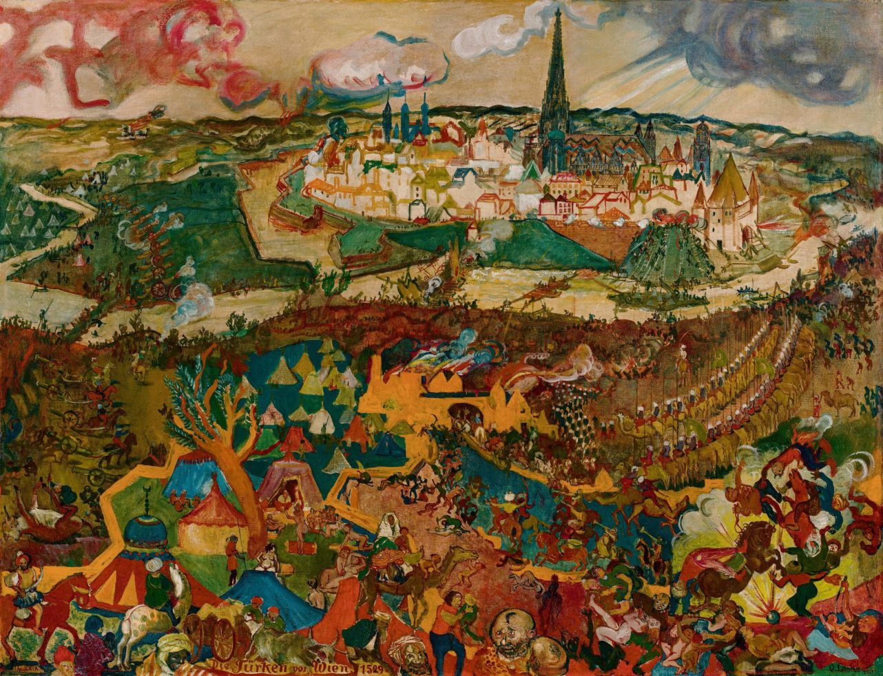 Die Wiener Kunsthändler dominieren naturgemäß bei Wiener-Werkstätte-Einrichtungsgegenständen des Jugendstil und Art déco. Die Galerie bei der Albertina Zetter etwa präsentiert eine Salongruppe mit rundem Tisch und vier Armlehnstühlen aus dem Jahr 1911 von Hans Ofner, die einst in der Villa Godderidge in St. Pölten gestanden hat. Von Oskar Laske, der auf der Messe mehrfach vertreten ist, kann hier eine 1922 als faszinierendes Schauerlebnis gemalte Darstellung der „Türken vor Wien“ im Jahr 1529 erworben werden.