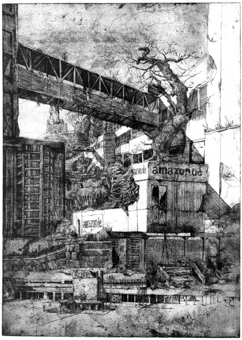 Die Zukunft war bei Soyon Jung schon da. Das Gebäude von Amazon ist auf ihrem Bild bereits verfallen, aus dem Dach wächst ein Baum. Ein wenig verunsichert diese dystopische Ansicht, die unser aktuelles Konsumverhalten spiegelt: Wenn es den Großkonzern nicht mehr gibt, wo sind dann wir? Ein bisschen erinnert die zeichnerisch perfekte Arbeit aber auch an die Sehnsucht der Romantik, die sich an schönen Ruinen entzündete – selbst wenn das Logistikzentrum eine eher mediokre Architektur ist. Die Sujets der Süd-Koreanerin, Jahrgang 1982, beschwören diese beiden Extreme und erzählen von der menschlichen Existenz, die zwischen den Epochen klemmt. Für ihre eindringlichen Sujets mischt Soyon Jung die Technik klassischer Radierung mit digitalen Drucktechniken. Die Galerie Jahn & Jahn bietet das Blatt auf der Art Cologne für 700 Euro (49,7 x 35,6 Zentimeter, Edition von 30 + 2 AP) an.
