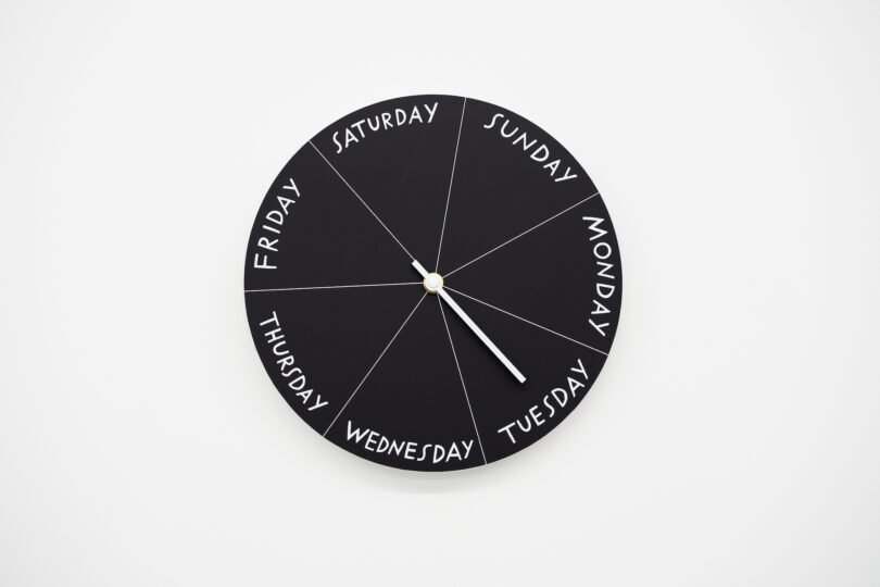 Der Rhythmus der Zeit ist ein wiederkehrendes Thema bei Shannon Finnegan. Die Tagesuhren „Have you ever fallen in love with a clock?“ bewegen sich so langsam, dass schwer zu sagen ist, ob sie überhaupt funktionieren. Denn statt Stunden und Sekunden zeigen uns die Uhren nur den Wochentag an. Entschleunigung pur! Finnegans Werke stellen häufig Möglichkeiten bereit, um Zeit mit Kunstwerken anderer zu verbringen. Dafür stellt sie gerne große Sitzbänke in Ausstellungsräume, die die Besucherinnen und Besucher dazu einladen sich auszuruhen, sich die Zeit zu nehmen, um dem Körper eine Pause zu genehmigen. Dabei richtet sich die New Yorker Künstlerin insbesondere an Menschen mit Behinderung, die sie mit und durch ihre Kunst miteinbeziehen möchte. Die Münchner Galerie Deborah Schamoni bietet die Tagesuhr (Durchmesser: 34 Zentimeter, Edition 3 + 1 AP) für 2500 Euro an.