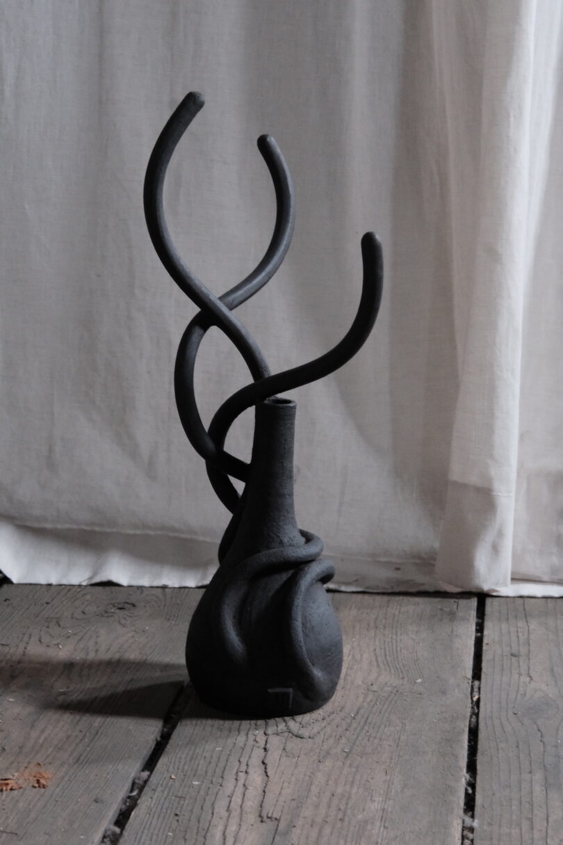 Die französische Künstlerin Violaine Toth lebt seit fünf Jahren in Berlin. In ihrem Studio in Neukölln kreiert sie außergewöhnliche Keramik. Ihre Arbeiten zeichnen sich durch schwungvolle Ornamente und verspielte Henkel aus. Dabei ist jedes Stück ein Unikat. Als Inspiration dienen ihr kosmische und botanische Formen. So auch bei der „Alien Vase 6“, die nicht nur im Titel an ein außerirdisches Wesen erinnert. Egal ob mit oder ohne Blumen ist die 37 Zentimeter hohe schwarze Vase ein echter Hingucker. Wer sich gerne selbst an der Drehscheibe versuchen möchte, kann bei Violaine Toth auch Töpferkurse buchen. Die Vase aus schwarzem Steingut kostet 330 Euro. Doch im vielfältigen Angebot der queeren Keramikkünstlerin ist für jeden Geldbeutel etwas dabei.