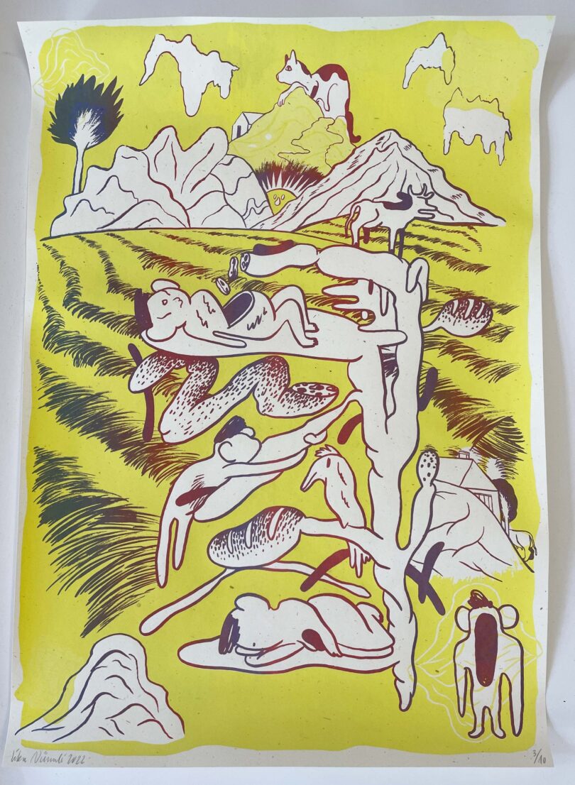 Das vielseitige Werk von Lika Nüssli umfasst Zeichnung, Comic, Malerei, Installation, Performance und Texte. Mit einem aufmerksamen Blick beobachtet die Schweizer Künstlerin ihre Umgebung und bringt sie in neue Formen. „Gestalten bedeutet für mich ein Statement abgeben,“ schreibt Nüssli, Jahrgang 1973, auf ihrer Website. Sie möchte Geschichte, Politik, aber auch persönliche Erfahrungen in ihrem Werk fassbar machen. Entdeckt haben wir ihren Siebdruck im Museumsshop des Baseler Cartoonmuseums. Hier kann die 59.4 x 42 Zentimeter große Arbeit für 190 Euro erworben werden. Wie in einem Traum fließen hier verschiedene Motive kunstvoll ineinander über. Bei jedem Anblick gibt es Neues zu entdecken. Alle Drucke haben eine individuelle Farbgebung und sind somit ein Unikat.