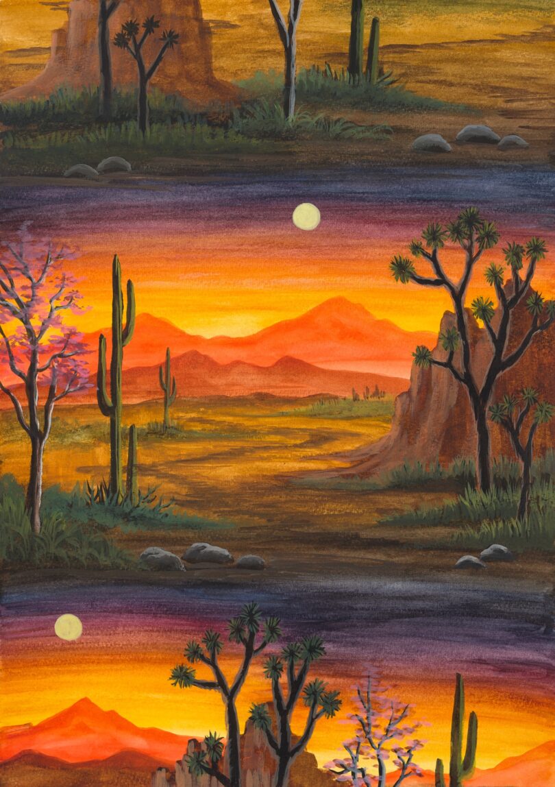 Als Inspiration für seine hypnotisierenden Landschaftsbilder nennt Neil Raitt den amerikanischen Hobbymaler Bob Ross und dessen Fernsehserie „The Joy of Painting“. Obwohl Raitt, Jahrgang 1986, aus Großbritannien stammt und dort auch arbeitet, gilt seine ganze Faszination den USA, dem Land der unbegrenzten Möglichkeiten. Das Spektrum amerikanischer Landschaften, die der junge Künstler in seinen Bildern zitiert, ist groß. Von grünen Palmen an der Westküste bis zu den Blue Ridge Mountains im Osten des Landes, von orangeroten Sonnenuntergängen bis zum dunkelblauen Nachthimmel. Gerne wiederholt der er bekannte Motive, manchmal variiert er sie oder verwebt gegensätzliche miteinander. Dabei kreiert er neue unbekannte Muster, die auf den ersten Blick wie digitale Renderings aussehen, in Wirklichkeit aber mit mit Wasser- und Acrylfarbe gemalt wurden. Die Berliner Galerie Judin bietet die Arbeit „Yucca Valley (Haze)“ von 2022 (42 x 29 Zentimeter) für 5000 Euro an.
