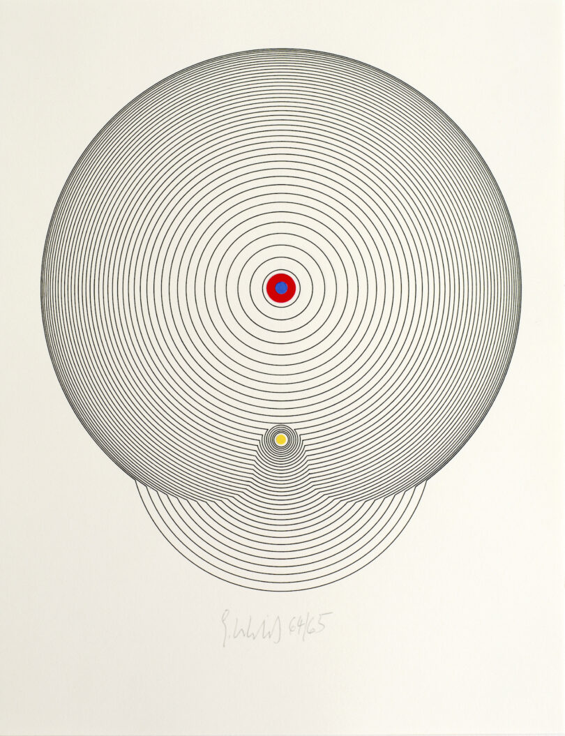 Als sich Gerhard Uhlig (1924–2015) in den 1960er-Jahren mit der Ästhetik der Kybernetik (der Wissenschaft der Steuerung von Maschinen und deren Analogie zu lebenden Organismen) auseinandersetzte, versuchte er die Auswirkungen neuer Informationstechniken auf unser Denken visuell festzuhalten. Dabei schuf er im Stil der Op-Art filigrane Tuschezeichnungen auf Papier. Der in Leipzig geborene Künstler entwickelte Bildkompositionen, die Volumen und Räume allein durch Linien bilden. Diese wurden von ihm durch sparsam eingesetzte Farbpunkte akzentuiert. Die zwei Kreise mit den zwei farbigen Punkten strahlen eine fast schon hypnotische Wirkung aus. Der Kunsthandel Henneken aus Westfalen bietet die 34,1 x 26,3 Zentimeter große Zeichnung (ohne Titel) für 4000 Euro an.