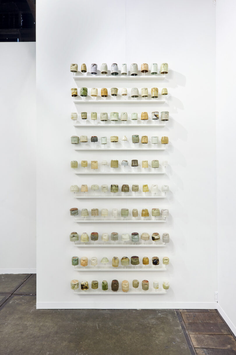 Die Galerie Jahn und Jahn mit Sitz in München und Lissabon zeigt eine Solopräsentation von Navid Nuur, die ganz im Zeichen des lebensspendenden Elements Wasser steht. Der 1976 in Teheran geborene und in Den Haag lebende Künstler zeigt Gemälde, Zeichnungen und 100 selbst getöpferte Trinkgefäße im Stil japanischer Keramik. Die merkwürdigen Vertiefungen an den Außenseiten der individuell geformten Becher stammen von pillenförmigen Nahrungsergänzungsmitteln, wie sie Leistungssportler zum Muskelaufbau einnehmen. Wer sich über dieses oder andere Themen mit dem Künstler unterhalten will, ist während der Messe dazu eingeladen, sich mit Navid Nuur zu einer 20-minütigen Performance unter vier Augen in ein kleines Separee auf dem Messestand zurückzuziehen (Preise zwischen 950 und 9800 Euro).