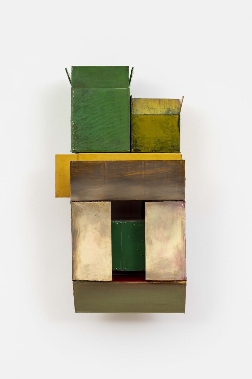 Was auf den ersten Blick aussieht wie Wandskulpturen aus massiver, glasierter Keramik, entpuppt sich bei näherem Hinschauen als ungewöhnliche Ensembles aus aneinander getackerten Pappkartons. Die niederländische Künstlerin Machteld Rullens, Jahrgang 1988, war es eines Tages leid, immer nur auf Leinwand zu malen. Angesichts der vielen leeren Kartons, die sich in ihrem Studio in Den Haag stapelten, kam sie auf die Idee, diese doch einmal zu skulpturalen Gebilden zusammenzusetzen, mit Ölfarbe zu bemalen und ihnen anschließend mit Kunstharz ein glattes Finish zu verleihen. Die ins Auge stechenden Resultate, irgendwo zwischen Shaped Canvases à la Frank Stella und Minimal Boxes à la Donald Judd, waren am Stand der Brüsseler Galerie Sorry We’re Closed bereits am ersten Tag der Messe nahezu ausverkauft (Preise zwischen 2500 und 9500 Euro).