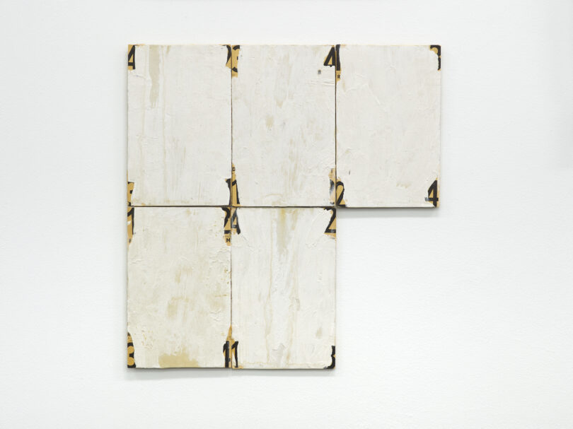 Die 1958 in Brüssel geborene belgische Video- und Objektkünstlerin Joëlle Tuerlinckx hat auf der Art Brussels natürlich ein Heimspiel. Am Stand von Nagel Draxler wird ihren Arbeiten viel Raum eingeräumt. Seit über 30 Jahren sammelt und archiviert Tuerlinckx Alltagsgegenstände, die sie neu arrangiert oder ganz pur zur Schau stellt. So etwa ein altes Holzfenster, das sie in Südfrankreich entdeckt hat. Die Arbeit „Platres Gouaches, 1,2,3,4,5“ (1976) besteht aus fünf weiß übermalten Kalenderblättern. Schon auf dieser sehr frühen Arbeit beschäftigte sich die damals 18-jährige Künstlerin mit Themen, die ihr späteres Werk prägen sollten: Licht und Schatten, Zeit, Raum und Wahrnehmung (Preise auf Anfrage).