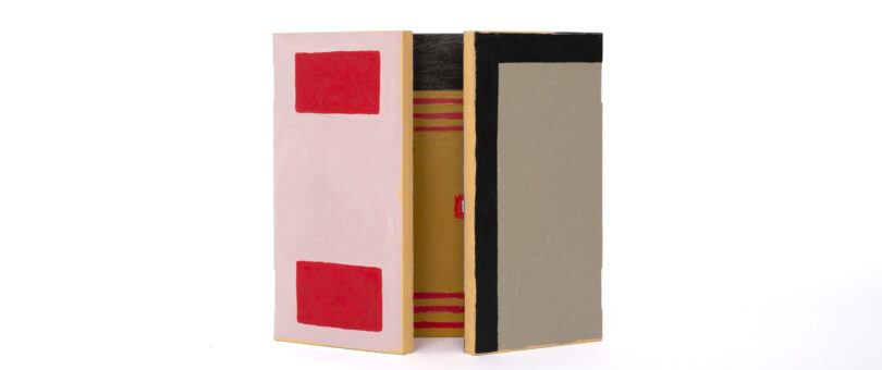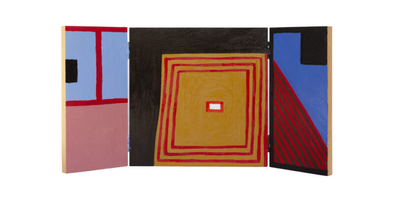 Die Anfang der 1980er-Jahre gegründete Memphis-Gruppe stellte die vordergründige Funktionalität von Designobjekten radikal in Frage. Das Ziel des in Mailand gegründeten Kollektivs war es alltägliche Objekte und Möbel farbenfroh und fantasievoll zu gestalten. Dabei standen individuelle Impulse der Designerinnen und Designer im Vordergrund. Sie vermischten die stilistischen Merkmale des Fünfzigerjahre-Kitsch, des Art déco und der Pop-Art. Die französische Künstlerin Nathalie Du Pasquier, Jahrgang 1957, gehörte zu den Gründungsmitgliedern. Ihre leuchtenden Musterentwürfe, die sich aus geometrischen und organischen Formen zusammensetzen, prägten das Bild der Memphis-Gruppe, bis sie sich im Jahr 1988 auflöste. Für die Arbeit aus dem Jahr 2022 bemalte Du Pasquier drei Holzplatten mit Ölfarbe. Wie ein Fester lassen sie sich aufklappen und wieder schließen. Die Pariser Galerie und Buchhandlung Yvon Lambert bietet das Unikat (50,5 x 1,5 x 25 Zentimeter) für 10.000 Euro an.