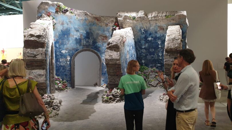 Alles gut also bei der Art Basel? In Hintergrundgesprächen erklären Kunstversicherer jedenfalls, dass die angemeldeten Werte deutlich höher seien als in den Vorjahren. Das kann bedeuten, dass die nach Basel transportierten Waren höherpreisiger oder mehr geworden sind. Der Blick in die Messestände im Erdgeschoss mit den sehr etablierten zeitgenössischen Positionen und der Handelsware legt Letzteres nahe. Dicht an dicht hängen und stehen die Kunstwerke in den Kojen, auf die Optik wird oft wenig Wert gelegt. Im Obergeschoss mit der jüngeren Kunst stehen die Chancen schon besser, Zeichen einer kuratierenden Hand oder eines Konzepts zu finden. Schließlich müssen die Galerien hier oft noch auf sich aufmerksam machen und ihre Visitenkarte abgeben. Für Monumentales, Sperriges oder sonstwie Raumgreifendes gibt es die Unlimted, bei der sich Besucher alljährlich die Sinnfrage stellen. Zu oft sind hier die immergleichen Namen mit ähnlichen Arbeiten zu finden, als dass noch wirklich Spannung aufkommen möchte. Doch es gibt immer wieder Ausnahmen, etwa der imaginierte Nachbau der Palastruinen von Sans Souci in Milot auf Haiti durch Firelei Báez mit dem Titel „the vast ocean of possibilities“ bei James Cohan aus New York oder die „Lightsteps“, eine Himmelsleiter aus Neonröhren, der im letzten Jahr verstorbenen Brigitte Kowanz aus dem Jahr 1990 bei der Wiener Galerie Krinzinger.