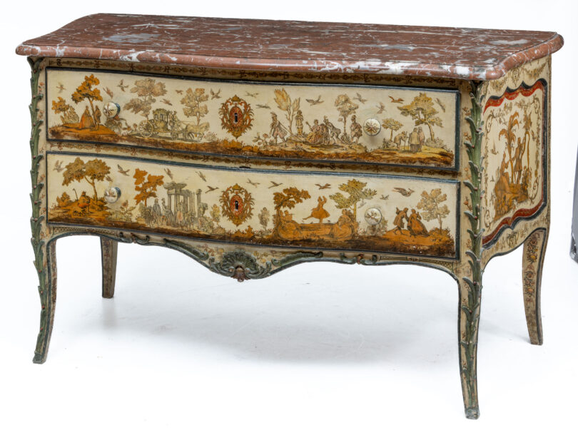 Die Begeisterung für asiatische Lackmöbel in Europa führte im 17. und 18. Jahrhundert dazu, dass man versuchte, sie zu imitieren. Dazu wurden im sogenannten „lacca povera“Verfahren meist handkolorierte Kupferstiche auf den hellen Untergrund aufgebracht, die mit einem gelblichen Lack („sandracca“) überzogen wurden. Die Auswahl an Motiven war grenzenlos, oft waren es jedoch figürliche Szenen, wie bei einer französischen Louis-XV-Kommode aus der Mitte des 18. Jahrhunderts, die am 24. Juni bei Leo Spik in Berlin zum Aufruf kommt (90 x 144 x 70 Zentimeter). Auf dem weiß gefassten Korpus aus Eiche und Nadelholz finden sich Galanterien, musizierende Hofdamen und Hirtenszenen. Das mit einer roten, grauweiß geäderten Marmorplatte versehene Prunkstück ist auf 6000 Euro geschätzt.