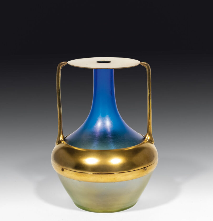 Die Kunstglasmanufaktur Loetz Witwe in Klostermühle gehört zu den bedeutendsten ihrer Art. Um 1900 wurde dort die in Blau-Grün-Tönen schimmernde Vase mit Messingmontur gefertigt. Der Jugendstil-Entwurf wird dem österreichischen Bühnenbildner und Maler Alfred Roller zugeschrieben. 1897 war er Mitbegründer der Wiener Secession, von der er sich aber 1902 wieder trennte. Entdeckt haben wir das edle Einrichtungsstück in der Galerie Bel Etage in Wien – ein echter Geheimtipp für alle Fans des Wiener Jugendstils. Dort steht die 22 Zentimeter hohe Vase aus irisierendem Glas für 8800 Euro zum Verkauf.
