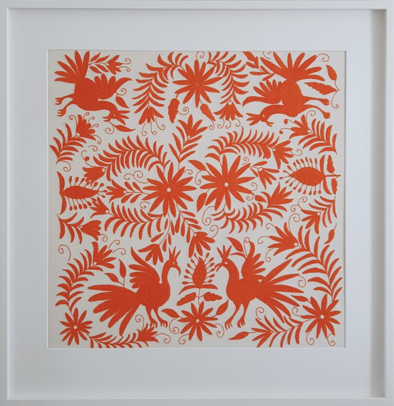Die traditionelle Sticktechnik der Otomi wird seit Generationen von den Frauen des indigenen Volkes in Mexiko praktiziert. Das Besondere ist ihre „blinde Stichtechnick“: Die Stiche auf der Vorderseite füllen das Muster, während auf der Rückseite nur die Konturen sichtbar sind. Die textilen Kunstwerke werden in Tenango de Doria im mexikanischen Bundesstaat Hidalgo von Hand gefertigt. Die lebendigen Darstellungen sind von der prächtigen Flora und Fauna des Landes inspiriert. Die Arbeit „Boxi“ misst 96 x 92 Zentimeter (inklusive Rahmen) und kann über die Düsseldorfer Galerie Sol & Art erworben werden. Sie kostet 2900 Euro.