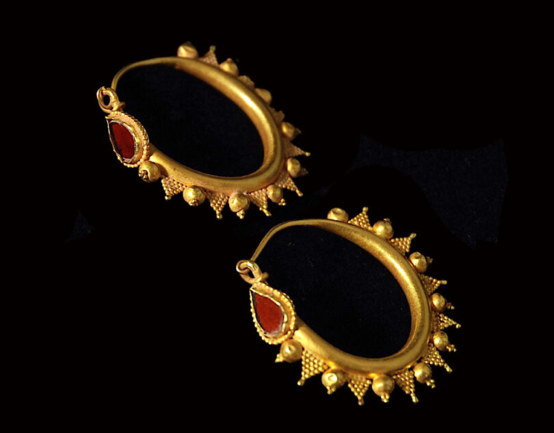Was für ein Fund! Diese wunderbar erhaltenen Goldcreolen stammen aus der Frühzeit des Hellenismus (4. bis 3. Jahrhundert vor Christus). Ihre Außenseiten schmücken Granulate in Traubenform und Goldkugeln in Form von Granatäpfeln, den Verschluss ziert ein tropfenförmiger Karneol. Entdeckt haben wir die antiken Kostbarkeiten (Durchmesser jeweils 3,2 Zentimeter) bei Christoph Bacher in Wien. Dort stehen sie für 4000 Euro zum Verkauf. Seit 2015 leitet Christoph Bacher seine Galerie, die ein großes Angebot an antiker Kunst besitzt. Vom Sarkophagdeckel bis zur römischen Bronzestatue – wer sich für Archäologie interessiert, wird hier sicher fündig. Auch Objekte unter 1000 Euro können hier erworben werden.
