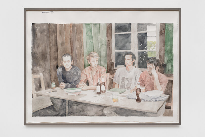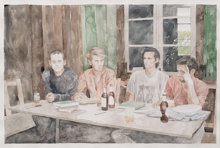Worüber haben die vier Männer wohl gerade gesprochen? Warum schauen sie so nachdenklich? Vielleicht erinnert sich der Künstler des Aquarells noch an die Gespräche, die vor der Hütte stattgefunden haben. Denn Friedemann Heckel, Jahrgang 1986, hat die Szene mit seinem Smartphone fotografiert, bevor er sie auf Papier malte. Die Bildvorlagen für die Serie, die in diesem Frühling bei der Berliner Galerie von Tomas Fischer zu sehen war, hatte der Künstler jedoch nicht explizit für dieses Vorhaben aufgenommen. Dennoch spiegeln die Figuren alle eine gewisse Melancholie, sie wirken in Gedanken verloren, das kühle Licht vermittelt eine gewisse Distanziertheit. Die Arbeit „Hütte“ aus dem Jahr 2021 misst 80 x 114 Zentimeter und kostet 7500 Euro.