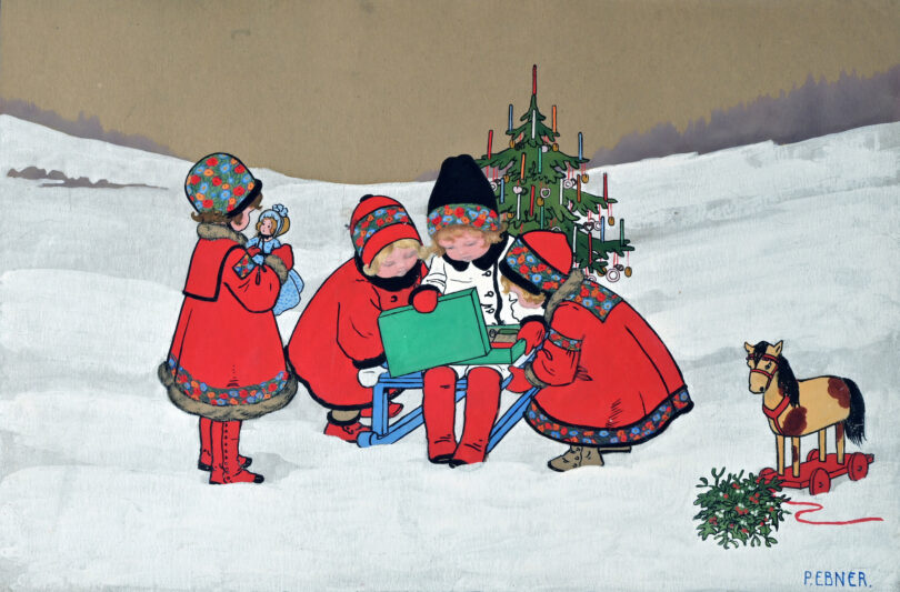 Kleine Kinder, insbesondere Mädchen waren das Lieblingsmotiv der österreichischen Illustratorin und Malerin Paula Ebner. Die 1873 geborene Künstlerin besuchte die private Malschule Strehblow in Wien. Sie illustrierte Kinderbücher, Postkarten und Wimmelbilder. Die Arbeit „Weihnacht“ aus dem Jahr 1906 zeigt vier junge Mädchen im Schnee, die vor einem Weihnachtsbaum Geschenke auspacken. Voller Neugier begutachten die Kinder die grüne Box. Was sich wohl darin verbergen mag? Entdeckt haben wir die Mischtechnik auf Papier in der Wiener Galerie Bel Etage. Sie misst 27,5 x 42 Zentimeter und kostet 3800 Euro.