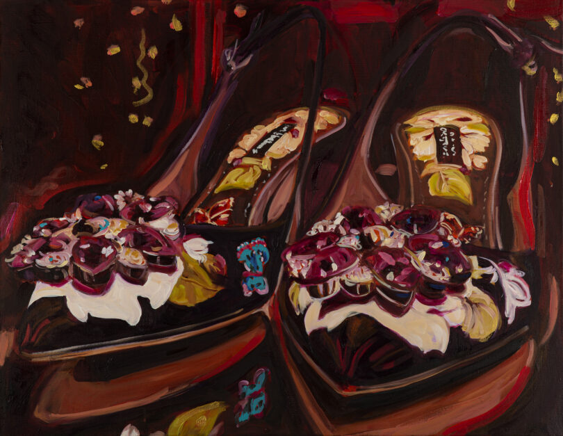 In uns allen steckt ein Stück Belle Époque. Sei es als melancholische Projektion, als Sehn- und Sehsucht oder auch als Abwehrhaltung gegen die Verklärung einer vermeintlich besseren Vergangenheit. Caroline Weihrauch führt uns das in ihren Bildern in höchst sinnlicher Weise vor Augen. Mit ihren Farbströmen umschmeichelt die Berliner Künstlerin die Bildräume und Gegenstände, bis eine Stimmung irgendwo zwischen Barock, Impressionismus und Postmoderne entsteht. Ihr Bilder mögen nostalgisch erscheinen, aber sie sagen mehr über unsere Gegenwart aus, als man auf den ersten Blick denkt. Über die Luxus-Pumps von Dolce Gabbana legt sie tiefe Rottöne wie schweres Parfüm und regt damit unsere Fantasie und Gedanken an: Geht es in der verführerischen Übertreibung auch um Kritik an Kapitalismus und Kritik? Das 70 x 100 Zentimeter große Gemälde „Quo vadis, la vie en Rose“ von 2023 ist für 4850 Euro bei der Malerin direkt zu erwerben.