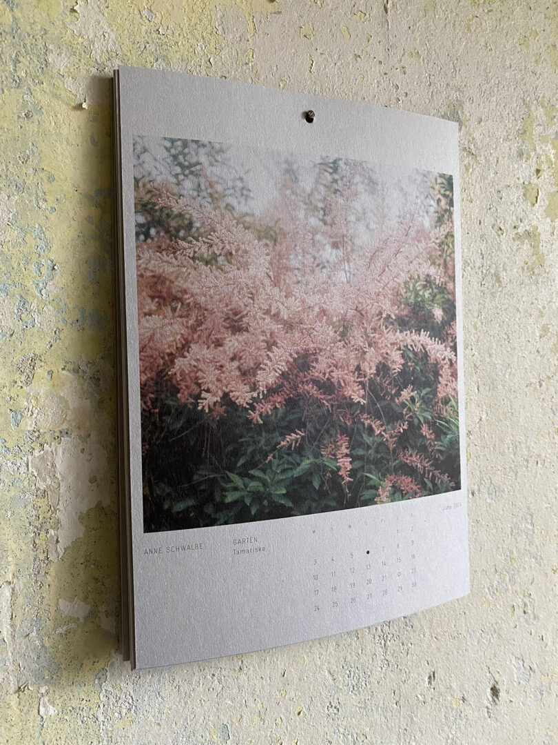 Die Natur steht im Mittelpunkt der Arbeit von Anne Schwalbe. Die deutsche Fotografin, Jahrgang 1974, studierte an der Ostkreuzschule bei Werner und Ute Mahler und bezeichnet sich selbst als Pflanzenporträtistin. Für das ZEIT Magazin fotografiert sie die Kolumne „Die Gärten der Anderen“, in der Felder, Vorgärten und Grünflächen von Freund:innen, Bekannten oder fremden Menschen gezeigt werden. Für ihren Gartenkalender hat sie 12 analoge Fotografien von Wiesen, Gärten und Bäumen ausgesucht, die sie auf ihren Streifzügen durch Mecklenburg, Rügen oder Österreich aufgenommen hat. Er kann für 35 Euro auf ihrer Website erworben werden. Der Erlös des Kalenders fließt in ein Crowdfunding für ihren Arbeitsraum an der Elbe, zwischen Berlin und Hamburg.