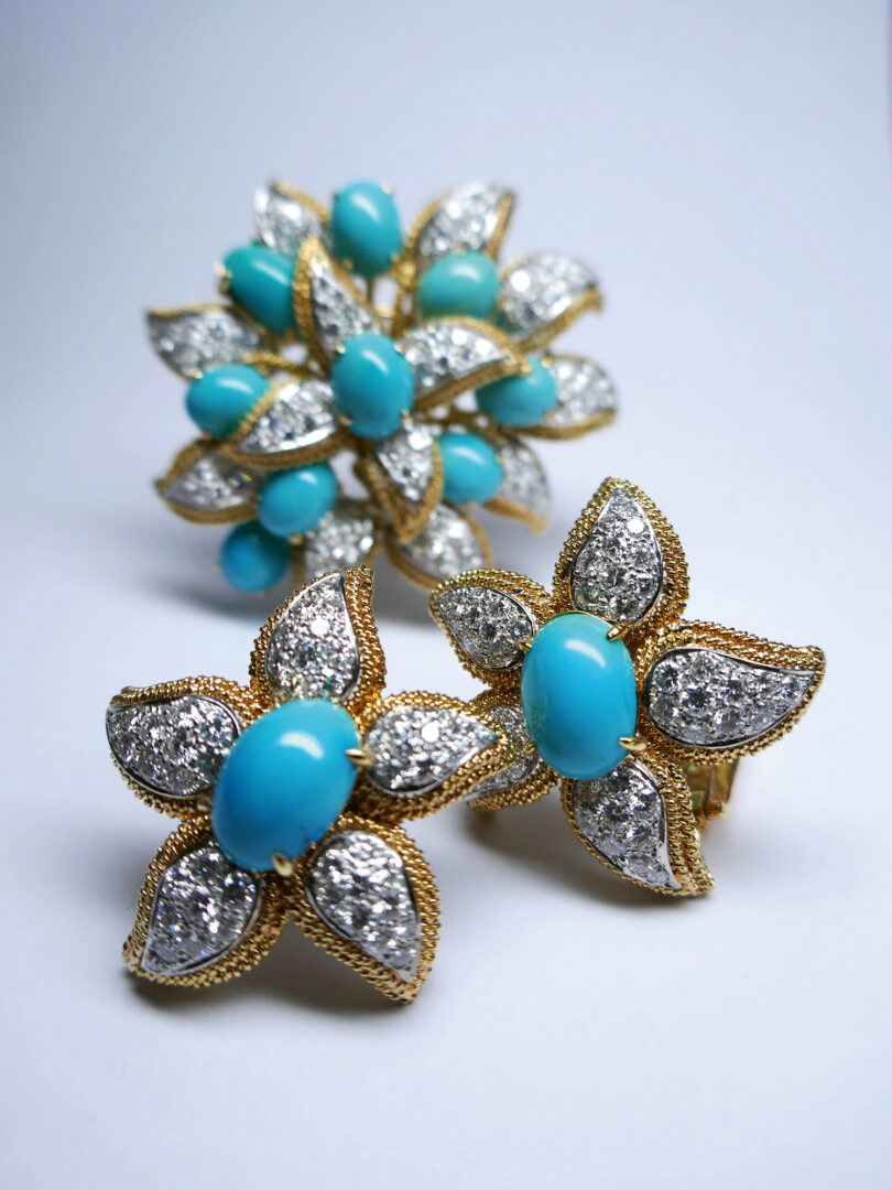 Mit „Le lac jaune“ (1987) von Friedensreich Hundertwasser setzt Schütz Art Society auf einen Künstler, der seit einiger Zeit wiederentdeckt wird. Populär war Hundertwasser immer, doch ein halbes Jahrhundert nach seinem Tod verändert sich der Blick auf sein Werk: 2018 gab es einen Auktionsrekord von 441.000 Euro für „Tender Dinghi“ in Regenbogenfarben. Ähnlich intensiv strahlt das goldene Set im Angebot von „Pintar – Schmuck und Silber des 20. Jahrhunderts“. Brosche wie Ohrringe sind mit Türkisen, Brillanten und Achtkant-Diamanten besetzt. Die griechische Juwelierdynastie Vourakis entwarf den Schmuck um 1970.