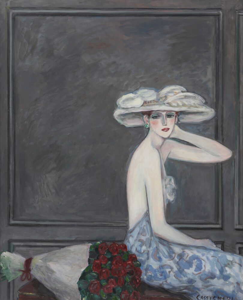 Zu ihnen gehört auch Jean-Pierre Cassigneul. Sein „Intérieur aux Roses Rouges“ verbindet nicht bloß Schönheit und Eleganz in einem figurativen Porträt. Das Motiv des bald 90-jährigen Pariser Malers setzt sich über jede zeitliche Zuweisung hinweg: Seine fragile Dame könnte den 1950er Jahren entstammen. Tatsächlich hat Cassigneul das Gemälde im Angebot des Kunsthandels Markus Strassner 1992 fertiggestellt.