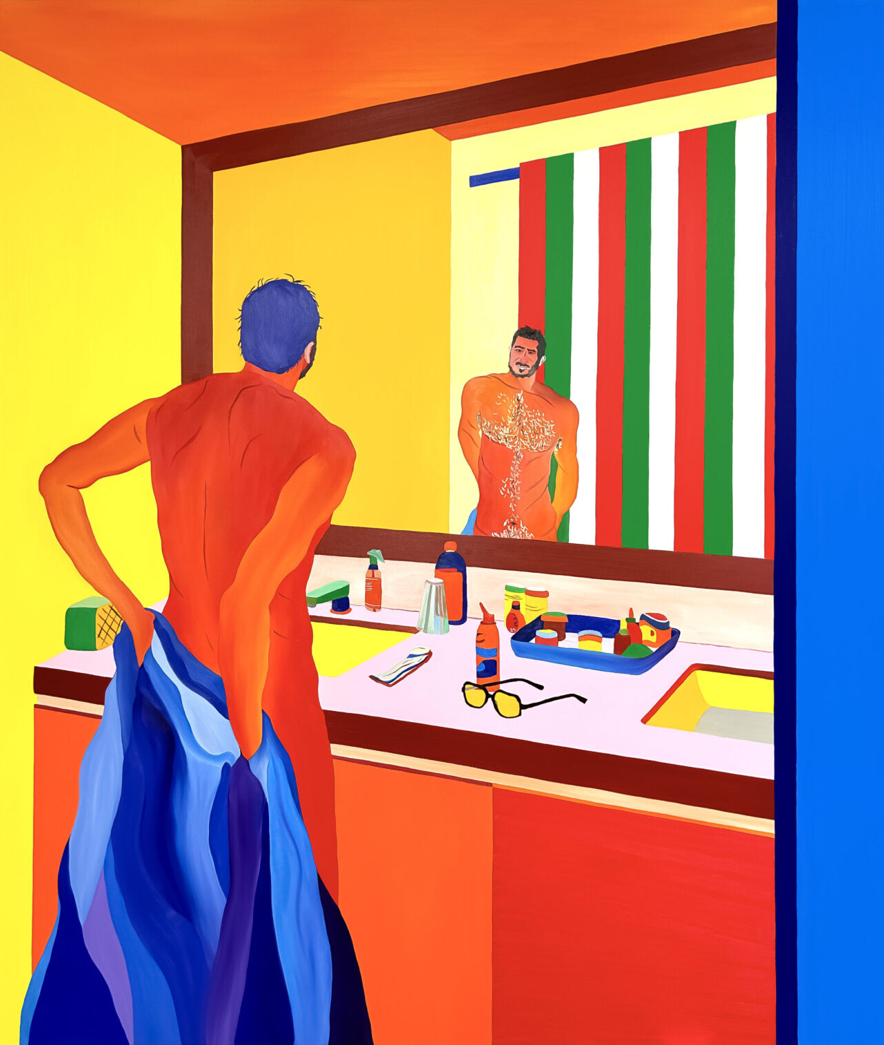 Mit Pilevneli und Dirimart reisen zwei Galerien aus Istanbul an, Studio G7 sitzt in Bologna, Dix9 ist in Paris ansässig, aus Kapstadt kommt die Galerie THK. Letztere zeigt aufstrebende Talente aus Südafrika und anderen Ländern des Globalen Südens erstmals in Düsseldorf. Bislang war THK auf Messen in London, Abu Dhabi und New York unterwegs, doch ihr Fokus verschiebt sich ins Rheinland. Die Berliner Galerie Dittrich & Schlechtriem bringt Gemälde von Navot Miller mit. Der 1991 in einer orthodoxen Siedlung im Westjordanland aufgewachsene Maler sorgt seit einiger Zeit mit Bildern für Furore, die sich in leuchtenden Primärfarben Millers schwulem Leben widmen. Dittrich & Schlechtriem vertritt ihn von nun an und gibt das auf der Messe offiziell bekannt. Auch das zeigt, wie wichtig die Art Düsseldorf geworden ist.