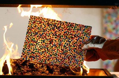 Damien Hirst befeuert im wahrsten Sinne den Absatz seiner NFTs – mit der Zerstörung seiner Bilder während der Londoner Kunstmesse Frieze