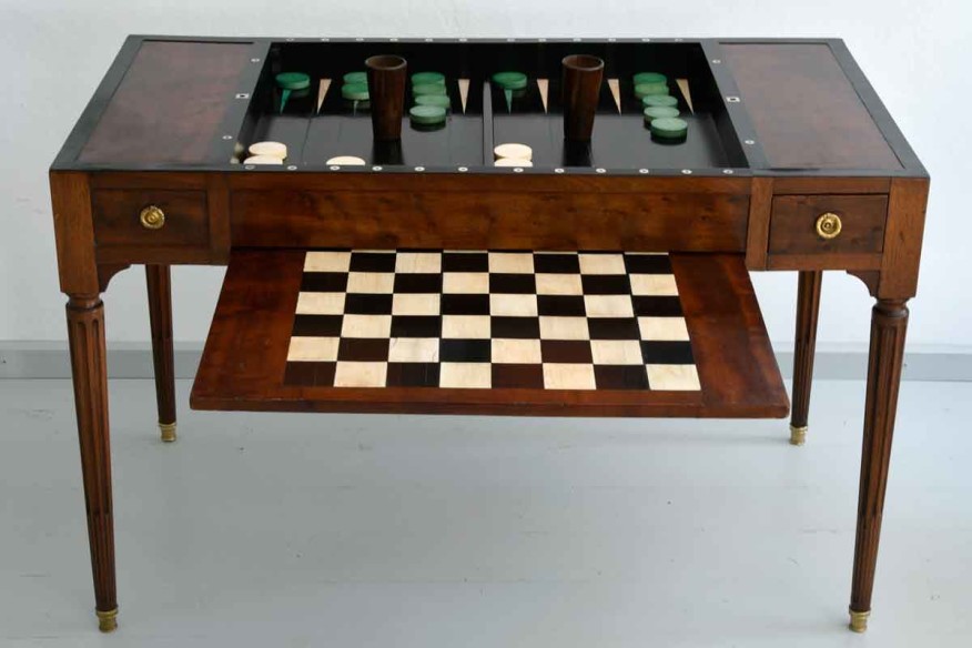 Tric-Trac-Tisch mit Spielsteinen und Schachfiguren, Frankreich, um 1790, 76,5 x 114 x 59cm (Foto: Kunsthandel Brigitte Martini, Epfach)