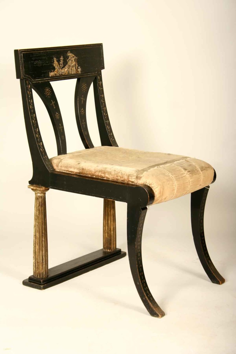 Neben viel süddeutschem Biedermeier fällt im Postpalast bei Veronika Czarny ein Hamburger Mahagoni-Aufsatzsekretär um 1820 ins Auge (6.500 Euro), ebenso wie ein rund einhundert Jahre jüngerer, „Revington London“ signierter Art-déco-Barschrank (7.500). Wer das dekorative Einzelstück sucht, muss sich bei Berhard Pfeiffer umsehen. Unter dem Motto „Ägyptomania“ bietet er unter anderem einen ausgefallenen geschnitzten, polychrom lackierten venezianischen Guéridon in Gestalt eines knienden Ägypters mit Pharaonenmaske, vom Ende des 19. Jahrhunderts an (2.300 Euro, Postpalast). Klaus Spindler wartet mit einer kleinen Sensation auf: dem einzigen original erhaltenen Exemplar des 1898 in München gefertigten schwarz gefassten Stuhls „für einen römischen Wohnraum“ mit farbigem Dekor und originaler Polsterung (Abb.), der auf einen Entwurf des Münchner Architekten und Innenausstatters Emanuel von Seidl (1856–1919) zurückgeht (alle Postpalast).
