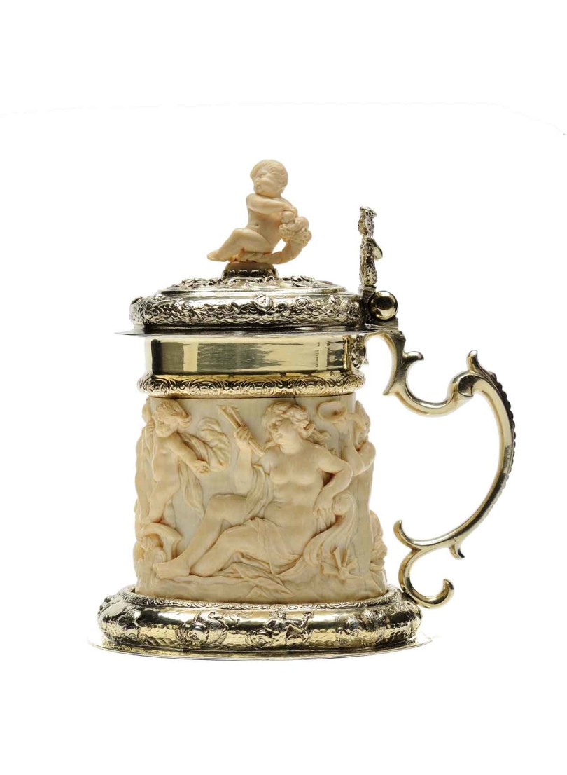 Bei den Highlights sind frühe Kunstkammer-Objekte am Gemeinschaftsstand der Kunstkammer Georg Laue mit der Kunsthandlung Dr. Julius Böhler und dem New Yorker Partner Tony Blumka vereint. Ein kunstvoll aus Knochen, Edelholz- und Zinneinlagen gearbeiteter Kamm aus dem Frankreich des 16. Jahrhunderts könnte aus dem berühmten Pommerschen Kunstschrank stammen (38.000 Euro, Blumka). Wohl von Frans van Bossuit stammt ein Paar Elfenbein-Reliefs mit Bathseba im Bad sowie Lot und seinen Töchtern aus der zweiten Hälfte des 17. Jahrhunderts (250.000 Euro). Die typische Mechelner Figur eines zauberhaft vollrund geschnitzten, segnenden Jesuskindes mit leicht geöffneten roten Lippen um 1500, das den Betrachter direkt anblickt. trägt auf dem Sockel die Umschrift „SALVA NOS OMNES SALVATOR MUNDI“ (35.000 Euro, beide Florian Eitle-Böhler). Augsburg war im 17. Jahrhundert das Zentrum für Silbermöbel und kostbare Kistlerarbeiten. Georg Laue offeriert eine unglaublich reich gestaltete höfische Hochzeitsschatulle, die als Gemeinschaftsarbeit des Kistlers Heinrich Eichler d.Ä. und dem Goldschmied Johann Andreas Thelot um 1685/95 in Schildpatt, Elfenbein, Silber und mit Gemälden geschmückt, entstand. Ein prachtvoll geschnitzter Elfenbeinhumpen verfügt über eine feuervergoldete Silbermontierung des Berliner Goldschmieds Johann Jacob Staude um 1680 (Abb.). Troger-Figuren, deren Körper aus Elfenbein mit Gewändern aus Holz geschnitzt sind, wurden zum Gattungsbegriff. „Echte“, wie der „Heilige Hieronymus“ um1730/40, den Laue offeriert, erkennt man an der virtuosen Qualität und dem reichen Anteil an Elfenbein im Verhältnis zum Nussbaumholz. Denn der bayerische Kurfürst stellte seinem Hofbildhauer Simon Troger das exotische Elfenbein-Material zur Verfügung.