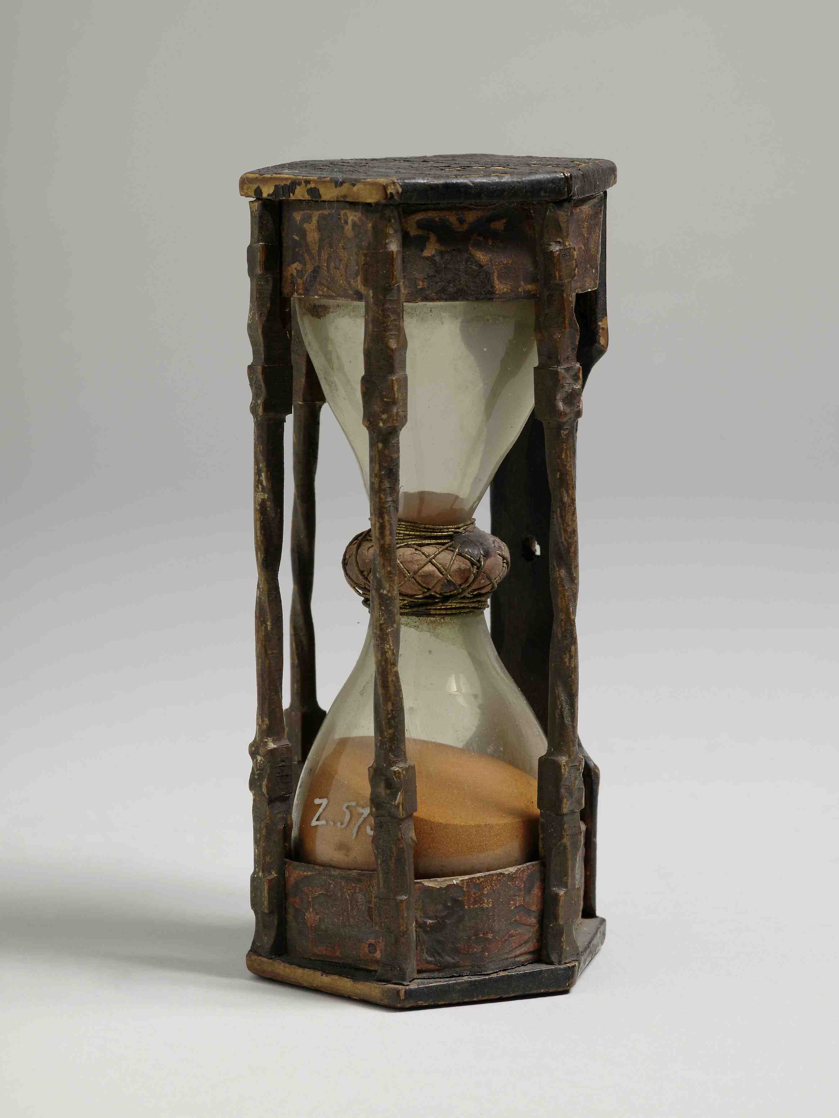 Ort und Zeit dieser Erfindung kennen wir nicht, doch recht viel älter als das Wandbild wird sie nicht sein. Denn als Voraussetzung musste durchsichtiges Glas als erschwinglicher Werkstoff zur Verfügung gestanden haben. Mit Wasser betriebene Auslaufuhren gab es bereits in der Antike. Die wiederholt zu lesende Vermutung, dass es damals auch schon Sanduhren gegeben habe, konnte nie bestätigt werden. Neben Quarzsand wurden die geblasenen Glaskolben mit Marmor-, Perlmutt- und Korallenstaub oder Bleikügelchen gefüllt. Ausschlaggebend für die Dauer des Durchrieselns ist die Größe der Öffnung, unabhängig von der Glashöhe. Im Vergleich zu mechanischen Zeitmessern ist die Herstellung von Sanduhren einfach und preisgünstig. Ihr unschätzbarer Vorteil war, dass sie ortsunabhängig sind und mobil mitgeführt werden können. Hinzu kommen ihre Wetterfestigkeit und geringe Störanfälligkeit. Kein Wunder, dass sie bis ins 19. Jahrhundert weit verbreitet waren.