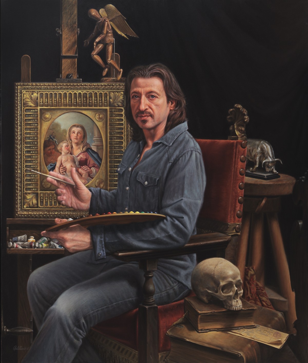 Eigentlich, sagt Castelluccio, hätte er Luca heißen sollen, wie sein Urgroßvater, nach dem Evangelisten und Schutzheiligen der Maler. In dieser Rolle malte er sich vor fünf Jahren auf einem Selbstporträt, inspiriert von Guercinos „Heiligem Lukas“, der die Madonna malt. „Ich habe immer gewusst, dass ich als Maler auf diese Welt gekommen bin.“ Das Selbstbildnis steckt voller Anspielungen. Das kleine Madonnenbild auf der Staffelei stammt aus seinem eigenen Besitz. Es ist von Francesco de Mura (1696–1782), der ebenfalls in Neapel geboren ist. Mittlerweile ist Castelluccio in den USA der größte Sammler des spätbarocken Künstlers und wird auch vier Werke als Leihgaben nach Florida schicken, wenn dort am 17. September die erste Einzelausstellung des Künstlers im Cornell Fine Arts Museum beginnt. Der kleine Stier taucht auf dem Bild als Attribut des heiligen Lukas auf sowie als Castelluccios Sternzeichen, und das Jeans-Outfit verweist auf seinen „Blue Collar“-Status, die Arbeiterklasse. Im Vordergrund lugt seine Geburtsurkunde aus einem ganz persönlichen Memento mori hervor: „Der menschliche Schädel ist ein Symbol des Schicksals, das uns mit Sicherheit erwartet, eine Erinnerung daran, dass wir aus jedem Tag das Beste machen sollten.“ Das Buch schließlich, in dessen Mitte ein Lesezeichen steckt, hat er eingefügt, weil „der Rest meiner Lebensgeschichte erst noch geschrieben werden muss“.