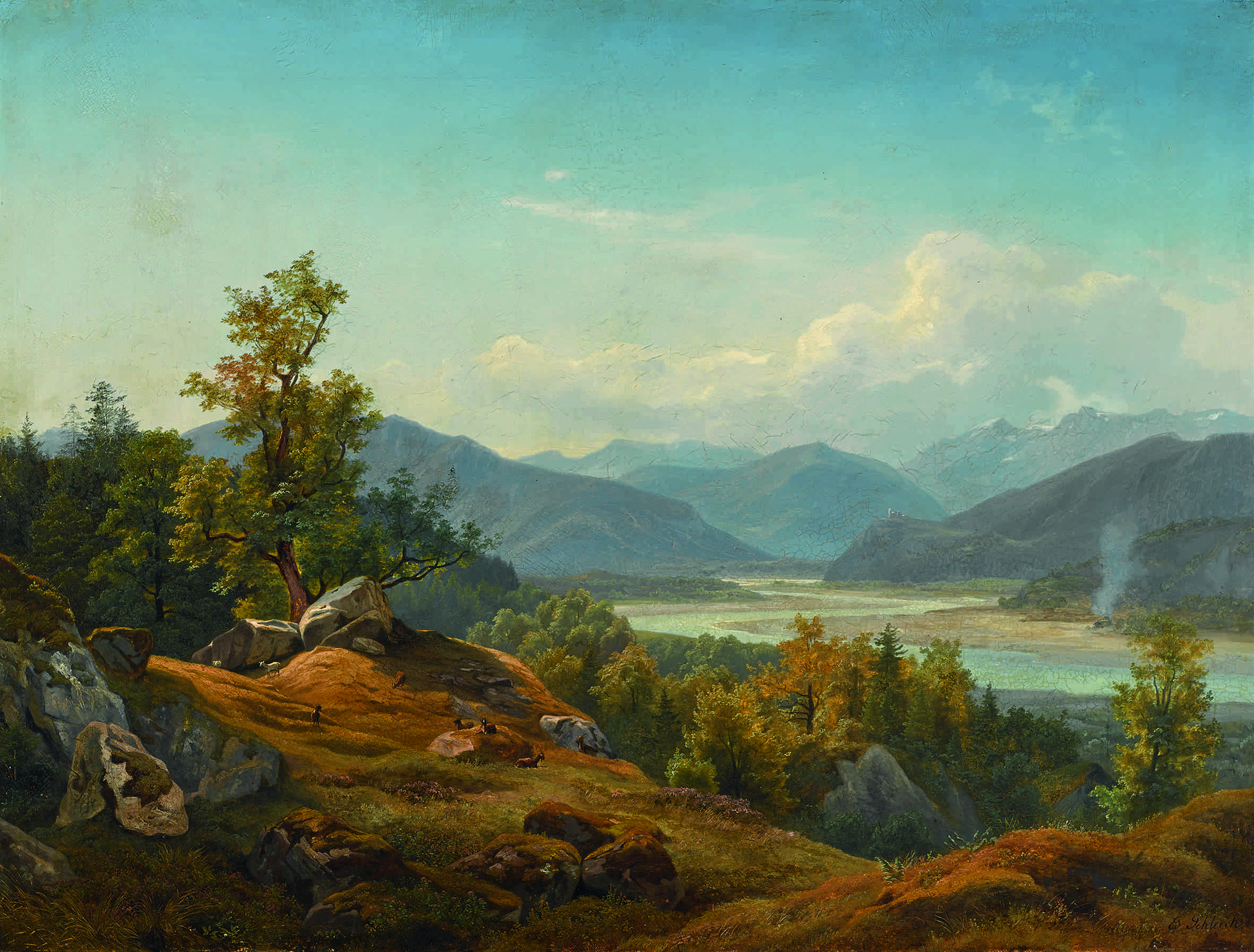 In seinen Anfängen orientiert an klassizistisch geprägten Zeitgenossen wie Carl Rottmann, fand Eduard Schleich der Ältere unter dem Einfluss des flämischen und niederländischen Barock schließlich zu einer realistischen Naturschau. Nach der Berührung mit den Malern von Barbizon zählte er in der zweiten Hälfte des 19. Jahrhunderts zu den stilbildenden Vermittlern der Paysage intime in Deutschland. Seiner Landschaftsauffassung entsprechend blieben erzählende Figuren- oder Tierstaffagen für ihn von untergeordneter Bedeutung; wenn er als Konzession an den Publikumsgeschmack dennoch nicht ganz auf sie verzichtete, überließ er die Ausführung nach Möglichkeit spezialisierten Kollegen wie Friedrich Voltz, Carl Spitzweg oder Alois Bach. Schleichs herausragende Bedeutung für die Entwicklung der Landschaftsmalerei in München ist nach wie vor unstrittig, doch blieb auch die Rezeption seines Œuvres von der schwindenden Wertschätzung der Malerei des 19. Jahrhunderts nicht ausgenommen. Es ist in diesem Zusammenhang auch bezeichnend, dass seit Siegfried Wichmanns 1951 erschienener Dissertation keine umfassende Monografie zu seinem Werk vorgelegt wurde. Immerhin würdigten die Gemäldegalerie Dachau und das Heimatmuseum seines Geburtsorts Vilsbiburg mit Ausstellungen den 200. Geburtstag des Malers vor drei Jahren. Der uneheliche Sohn eines hohen bayrischen Staatsbeamten besuchte nach dem Tod des Vaters das katholische Seminar in Amberg, bevor er 1827 an die Königliche Kunstakademie in München aufgenommen wurde. Der Besuch der Historienklasse war indessen offenbar nicht vom erhofften Erfolg begleitet, denn schon nach kurzer Zeit wurde dem unmotivierten Studenten aufgrund „völliger Tatenlosigkeit“ der Abgang von der Akademie nahegelegt – angeblich begleitet von der sarkastischen Empfehlung des Akademieleiters Peter von Cornelius, sich besser als Schuster zu versuchen. Der 15-Jährige pfiff auf den wohlmeinenden Rat und verlegte sich fortan auf Landschaftsdarstellungen – eine Disziplin, die während der Amtszeit des noch ganz der romantisch-idealistischen Kunstauffassung verpflichteten Nazareners Cornelius in den Lehrplänen der Akademie ohnehin nicht vorgesehen war. Der Anfänger war mithin auf autodidaktische Studien vor der Natur angewiesen, um sich das nötige Handwerkszeug zu erarbeiten. In diesen frühen Jahren orientierte er sich bei seinen Partien aus den Alpen und dem Voralpenland vornehmlich an Vorbildern wie Johann Jakob Dorner d.J., Christian Morgenstern, Carl Rottmann und dem zeitweilig ebenfalls in München tätigen Norweger Thomas Fearnley. Namentlich von Fearnley übernahm er die zu einheitlicher Oberflächenglätte zusammengefasste Organisation aller Kompositionsteile, während seine anfangs noch sehr leuchtende Palette von den „historischen“ Landschaften Rottmanns inspiriert war. Obwohl das früheste bekannte Gemälde, das gleichzeitig den Beginn seiner ersten markanten Schaffensphase markiert, erst 1832 datiert ist, ist bereits zwei Jahre zuvor eine erste Beteiligung an den Ausstellungen des Münchner Kunstvereins nachweisbar. Das folgende Jahrzehnt ist nur lückenhaft dokumentiert – erst für das Jahr 1841 erwähnen seine Biografen eine Wanderung durch das Inntal mit dem Tiermaler Friedrich Voltz. Auch danach unternahm er, häufig in Begleitung von Spitzweg und anderen befreundeten Malern, zahlreiche Exkursionen und Studienreisen, die ihn unter anderem nach Tirol, Oberitalien, Prag, Dresden und Leipzig führten.