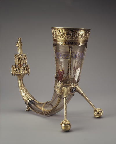 Die Petersburger Eremitage besitzt ein syrisches Glas des 14. Jahrhunderts in Form eines Horns (Fassung von 1551), Glass, Emaille, Silber, H: 29,5 cm, vergoldet, (Foto: The State Hermitage Museum, St. Petersburg)