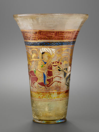 Größer könnte der Kontrast dieser gedrungenen Reliefbecher zu den zarten, transparenten, mit bunten Emailfarben und Vergoldung geschmückten „Aleppo-Gläsern“ kaum sein. Ihre Blütezeit fällt in die zweite Hälfte des 13. Jahrhunderts. Nach dem Untergang der Fatimidenherrschaft 1171 erlebte Aleppo unter der Regierung von Nasir II. Yusuf (1237–1260) eine künstlerische Blüte, zu der die weithin exportierten Gläser gehören.